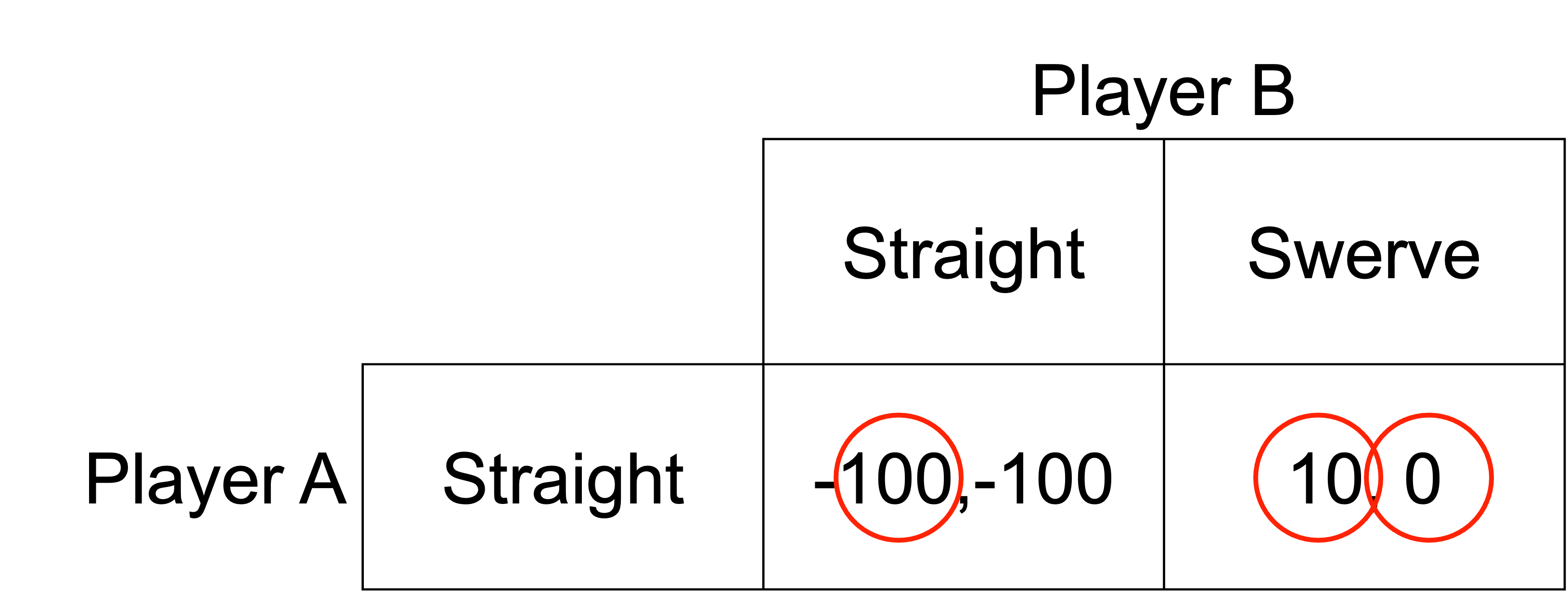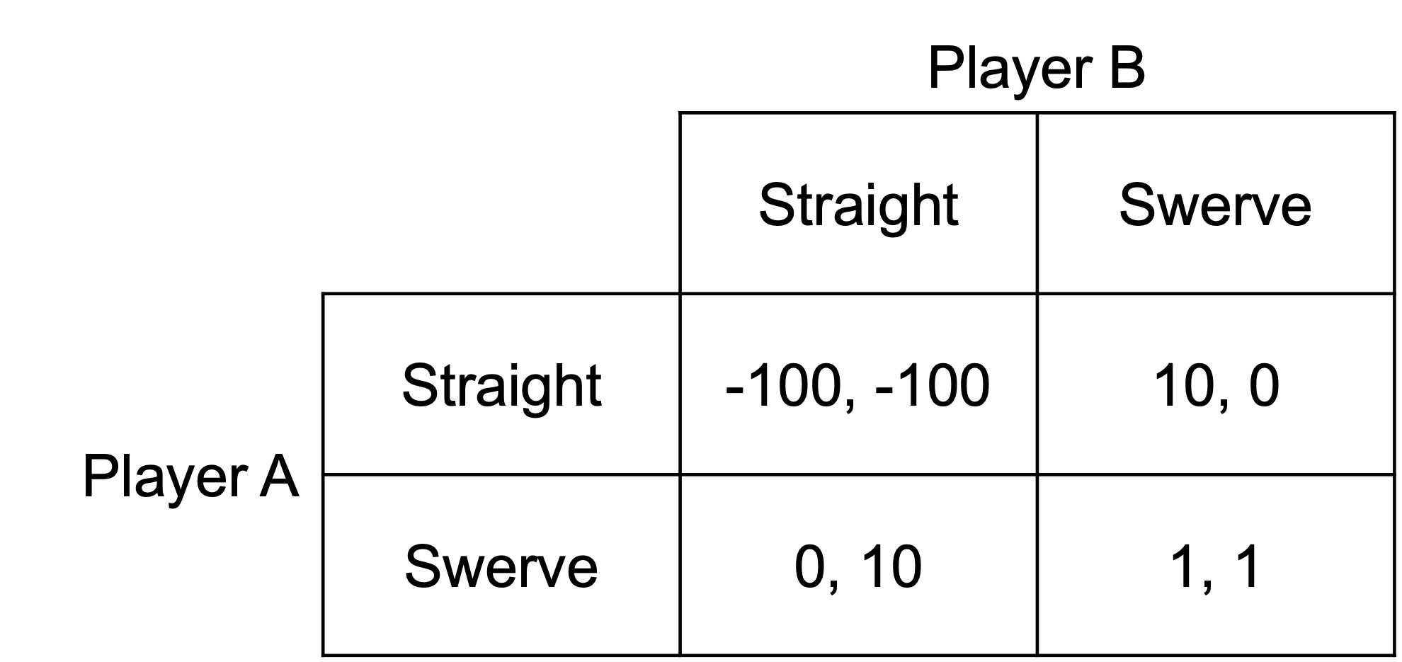 As another example, recall the game of chicken. Two players are driving toward each other. Whoever swerves first loses. If neither swerves, they crash and die.