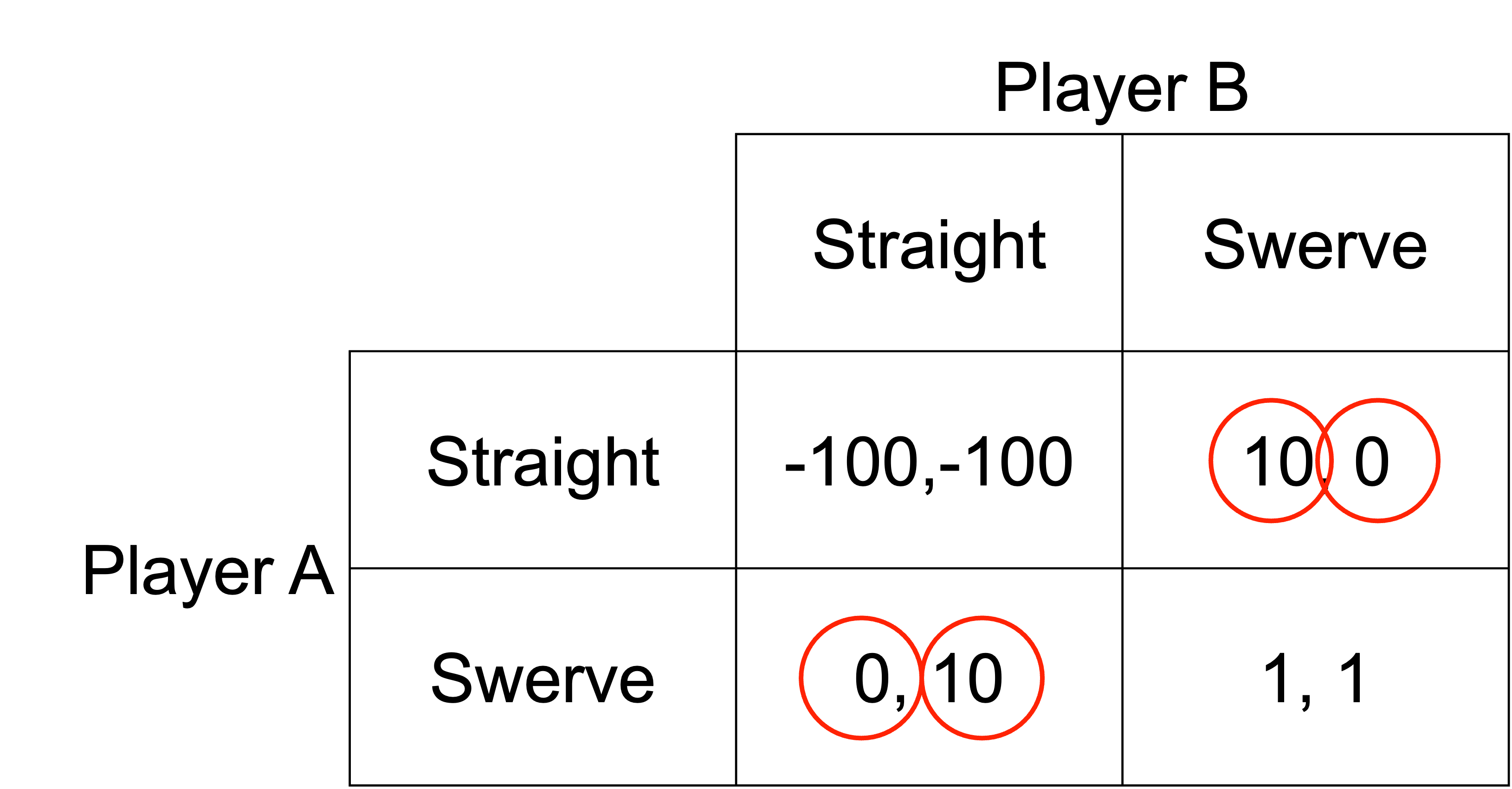 There are two pure-strategy Nash equilibria: (Straight, Swerve) and (Swerve, Straight). If the other player swerves, they want to go straight. If the other player goes straight, they want to swerve.