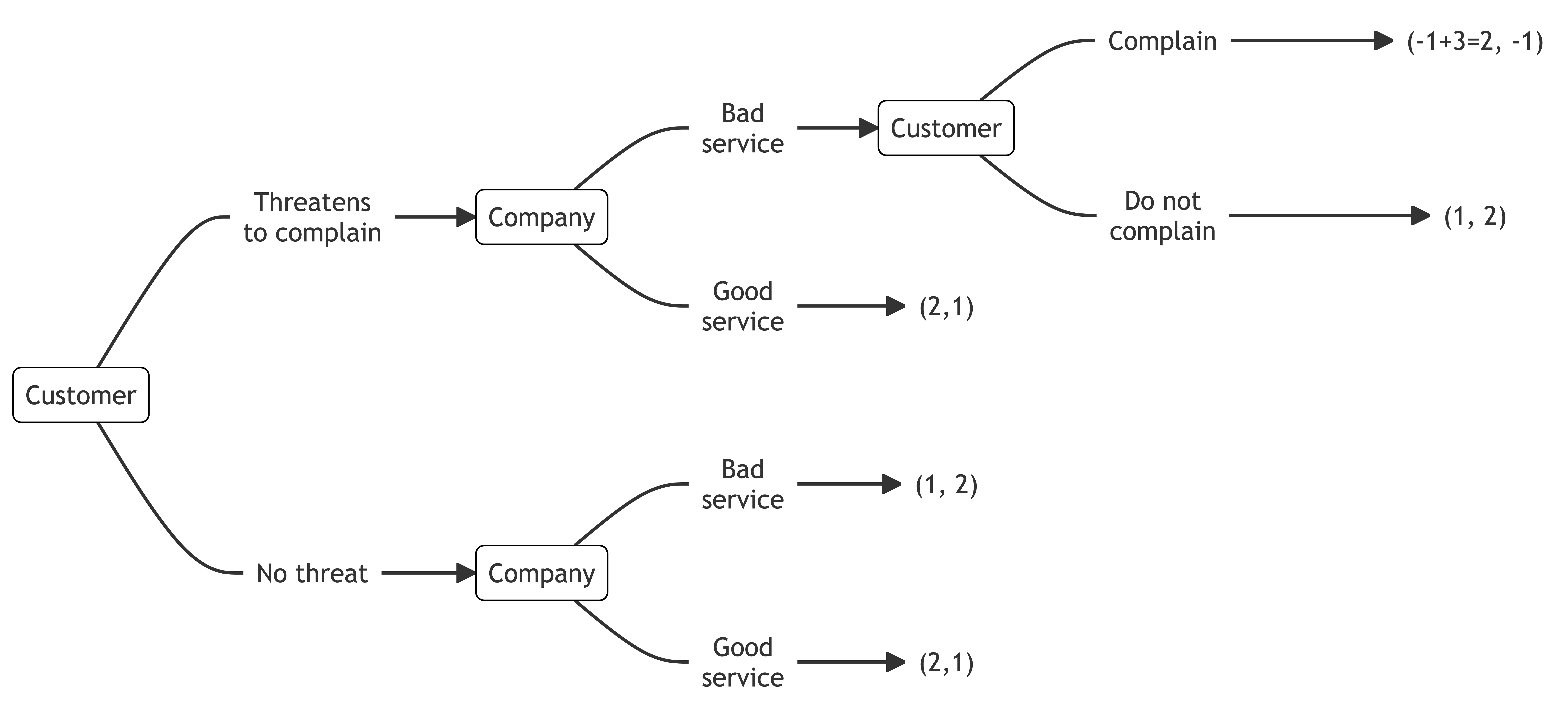 Recall our earlier example in Section 43.2.3, illustrated below, of a customer threatening to complain if they receive bad service. Complaining is costly.