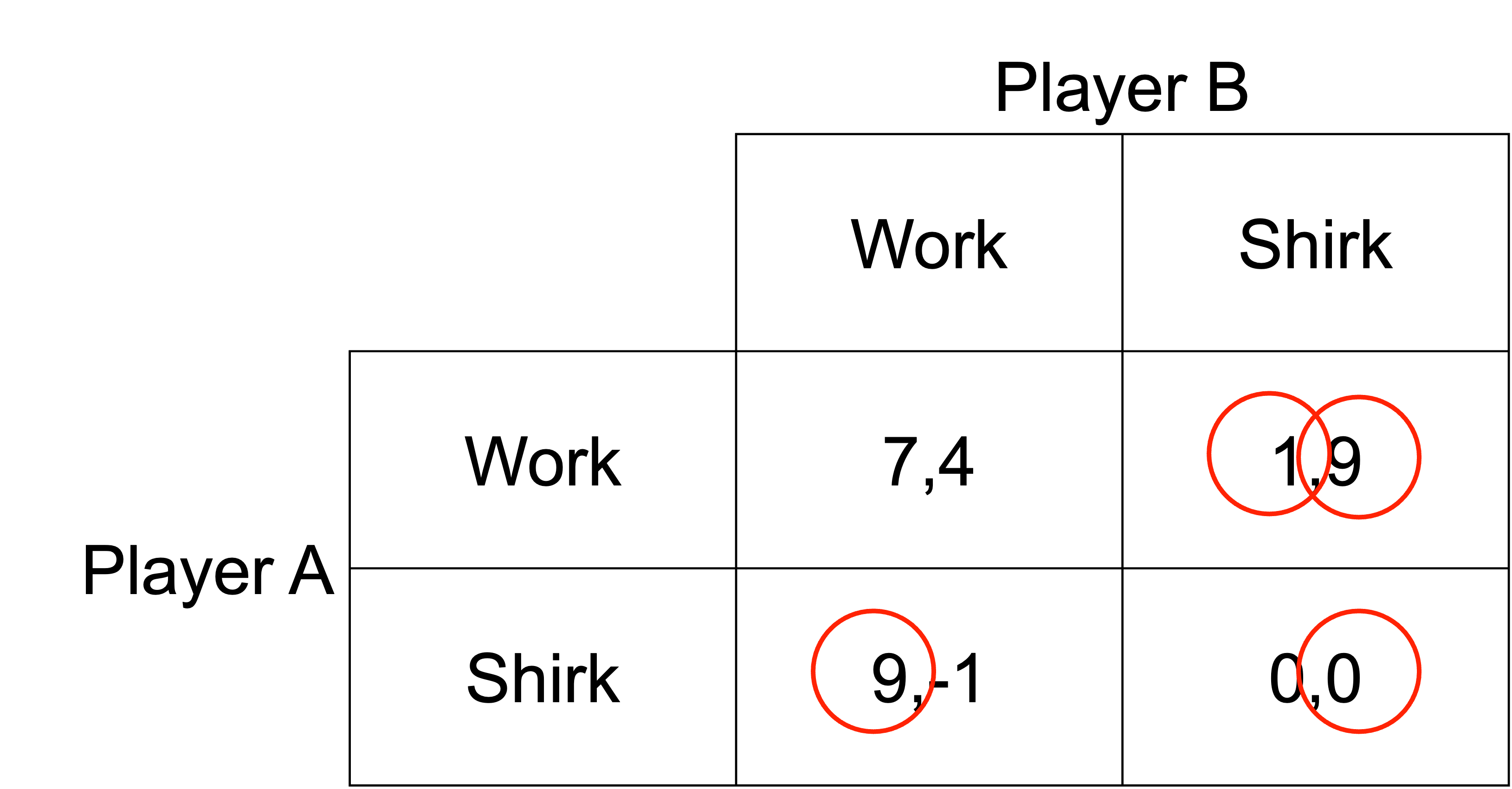 Each player needs to decide if they will work or shirk. If they both work, they receive a good payoff. They receive an ever better payoff, however, if they shirk while the other works.