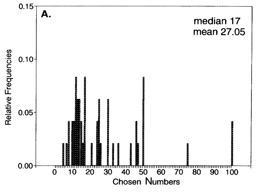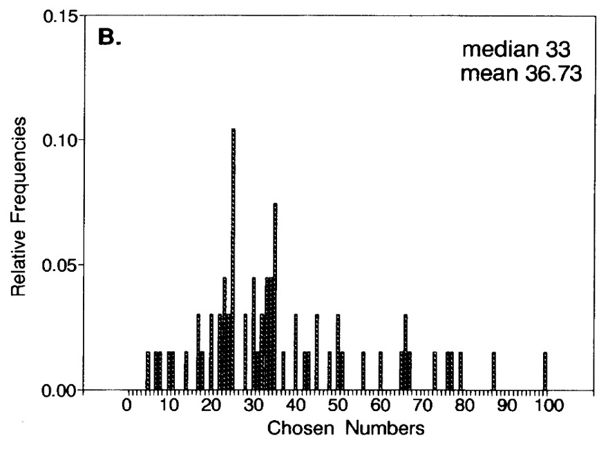 The following charts come from Nagel (1995), with p=1/2 and p=2/3. The charts show the distribution of chosen numbers in the p-beauty contest.