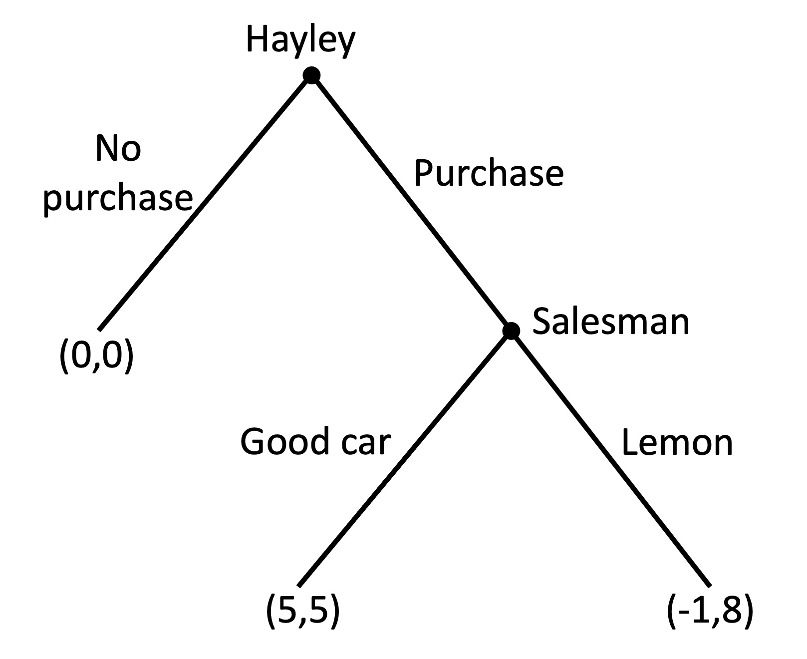 The payoffs (x,y) for each decision are indicated in the game tree below, with x being the Hayley’s satisfaction and y being the salesman’s profit.