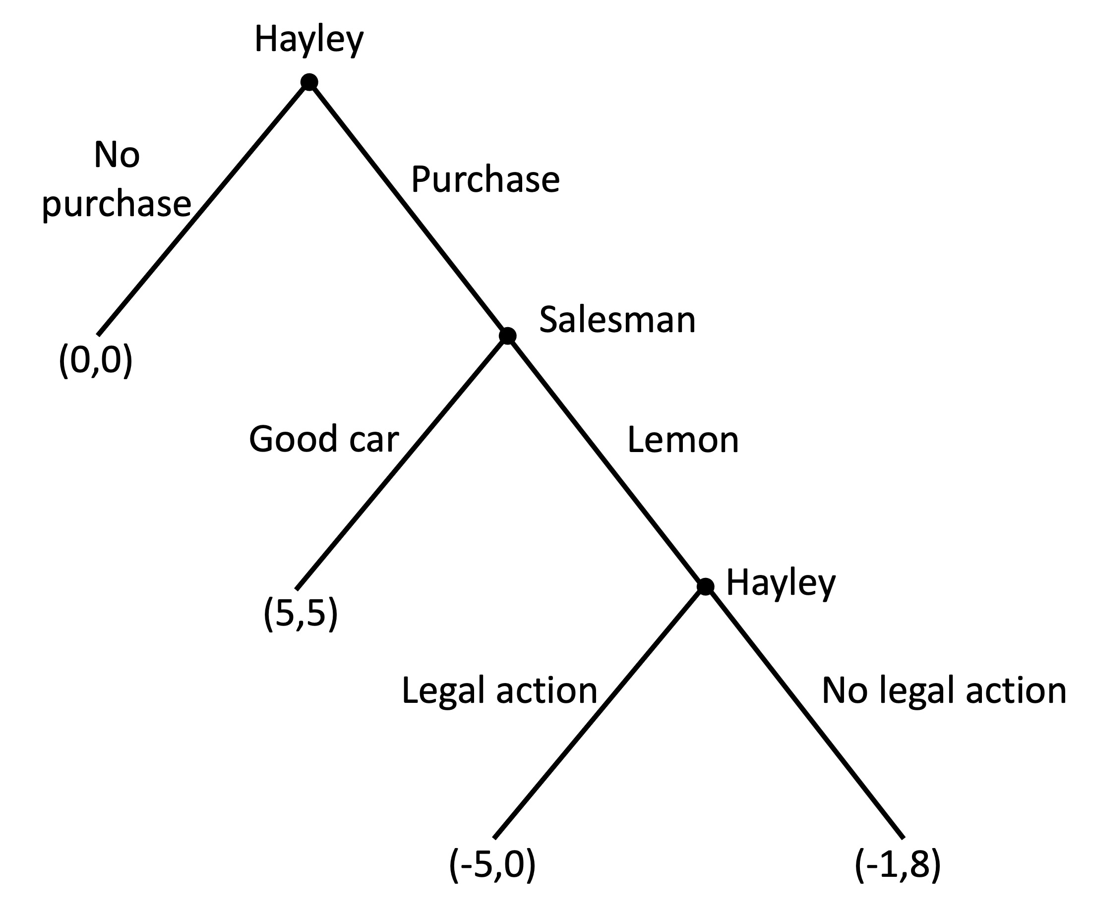 Hayley now has a choice between a payoff of 1 by taking legal action and a payoff of -1 for accepting the lemon. She would take legal action.