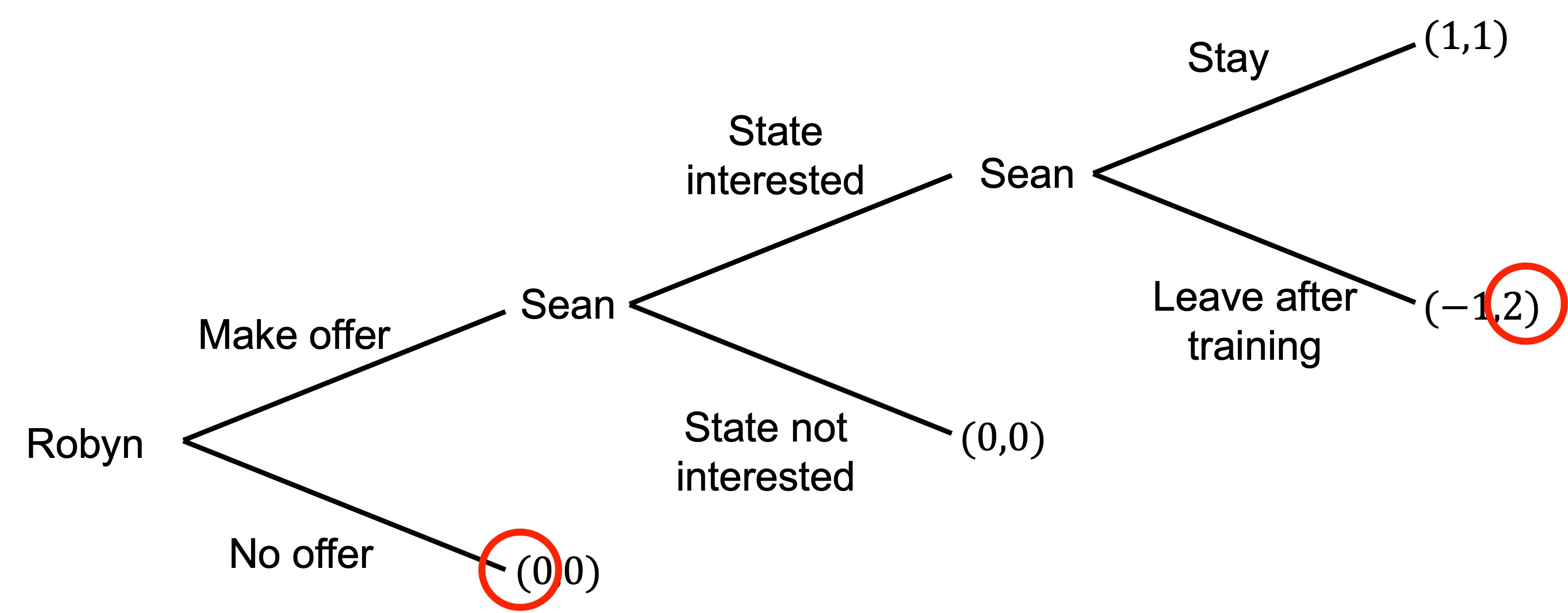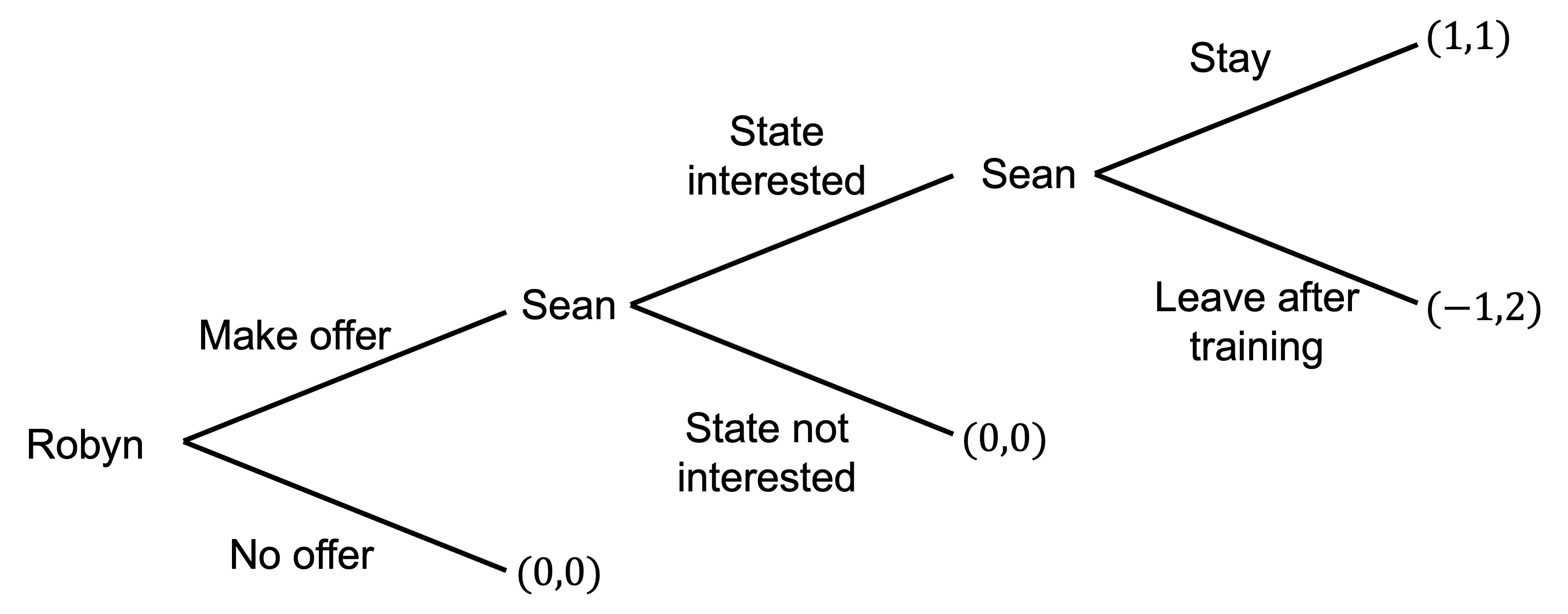 The subgame-perfect equilibrium is (No offer; State interested, Leave after training).