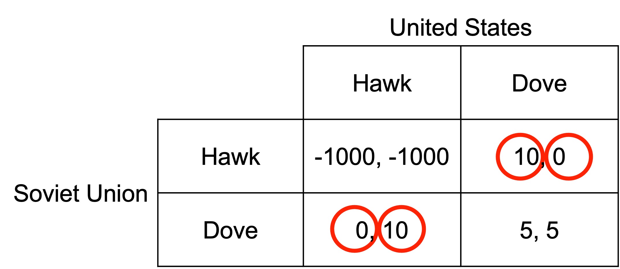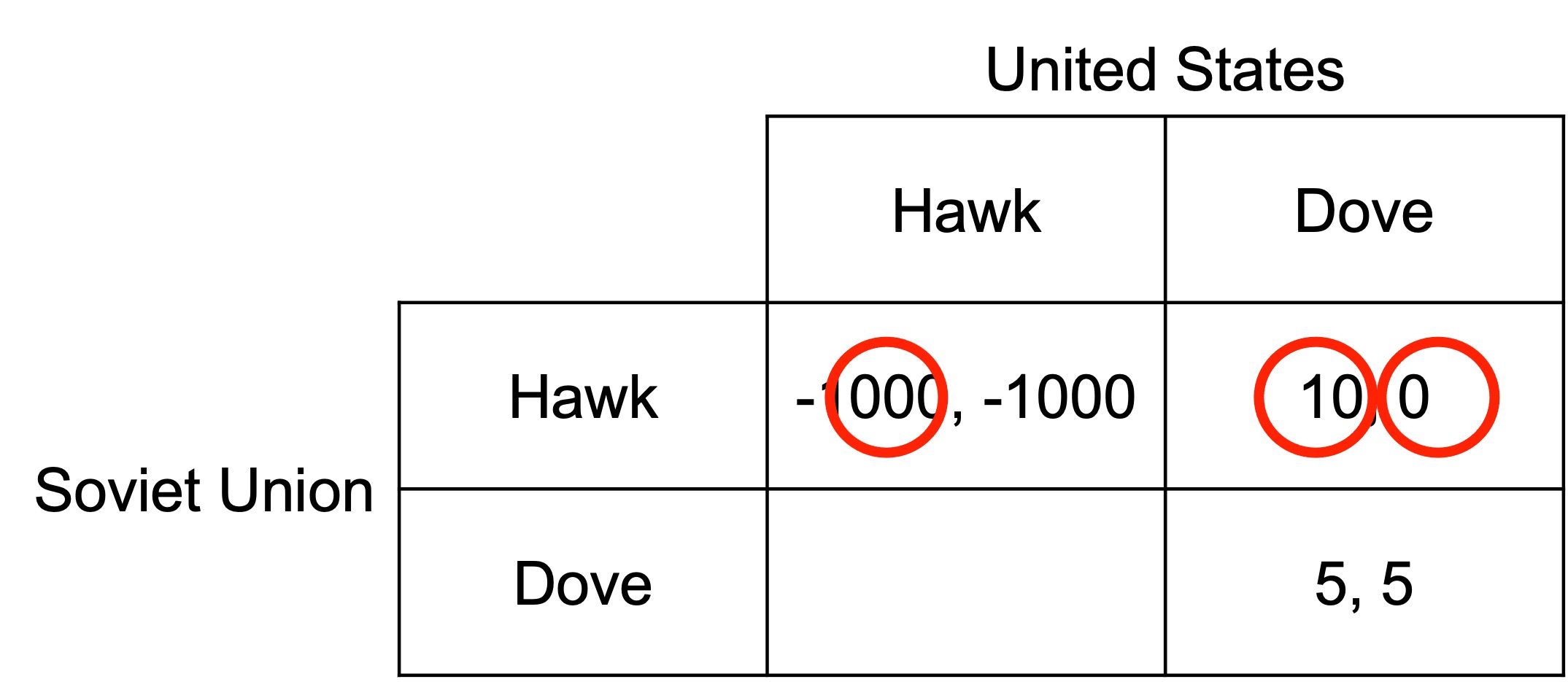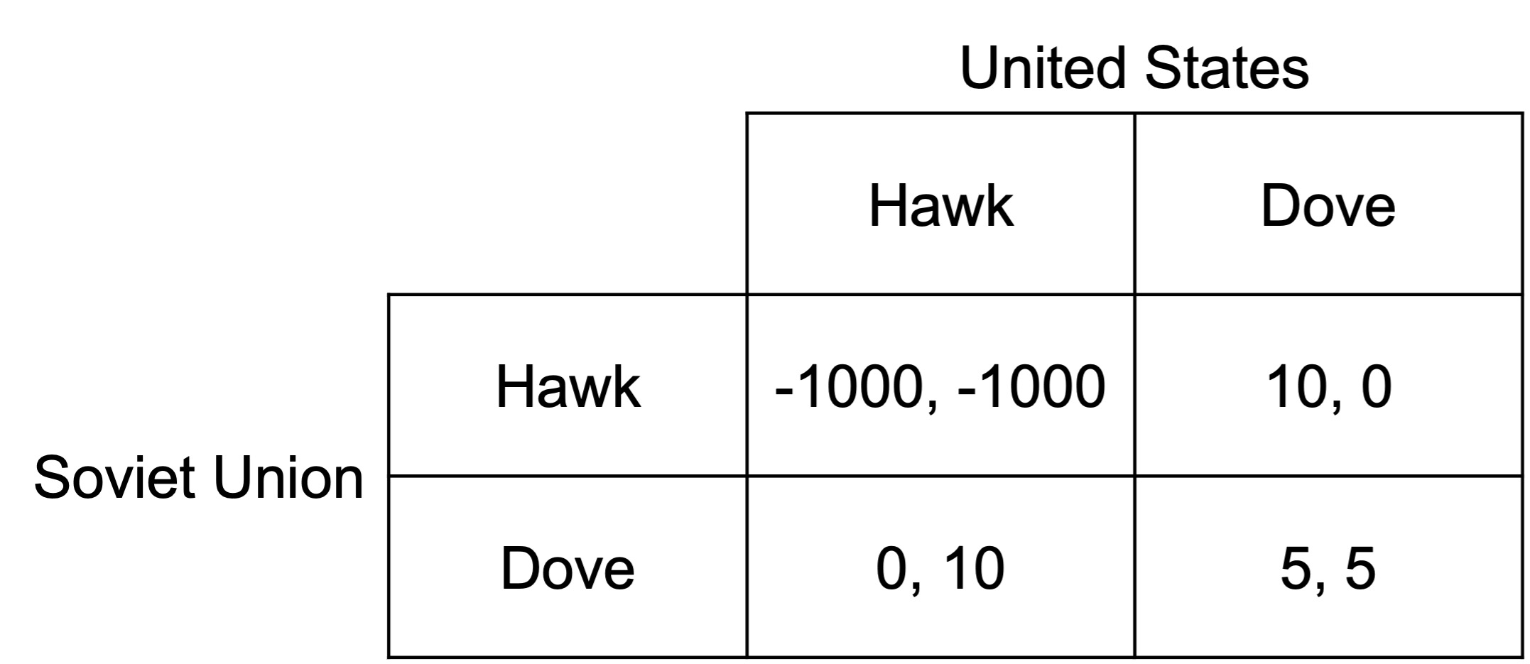 Suppose each player is considering whether they should act aggressively (hawk) or peacefully (dove). If one plays hawk while the other plays dove, they win the cold war. If both play hawk, there is a nuclear armageddon.