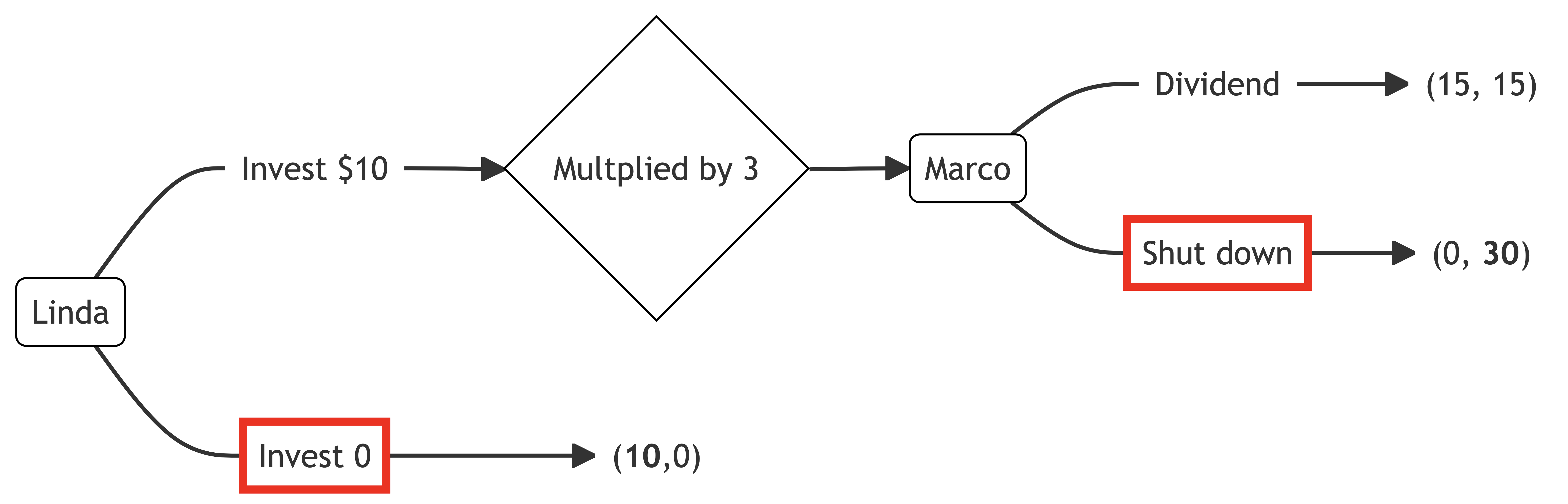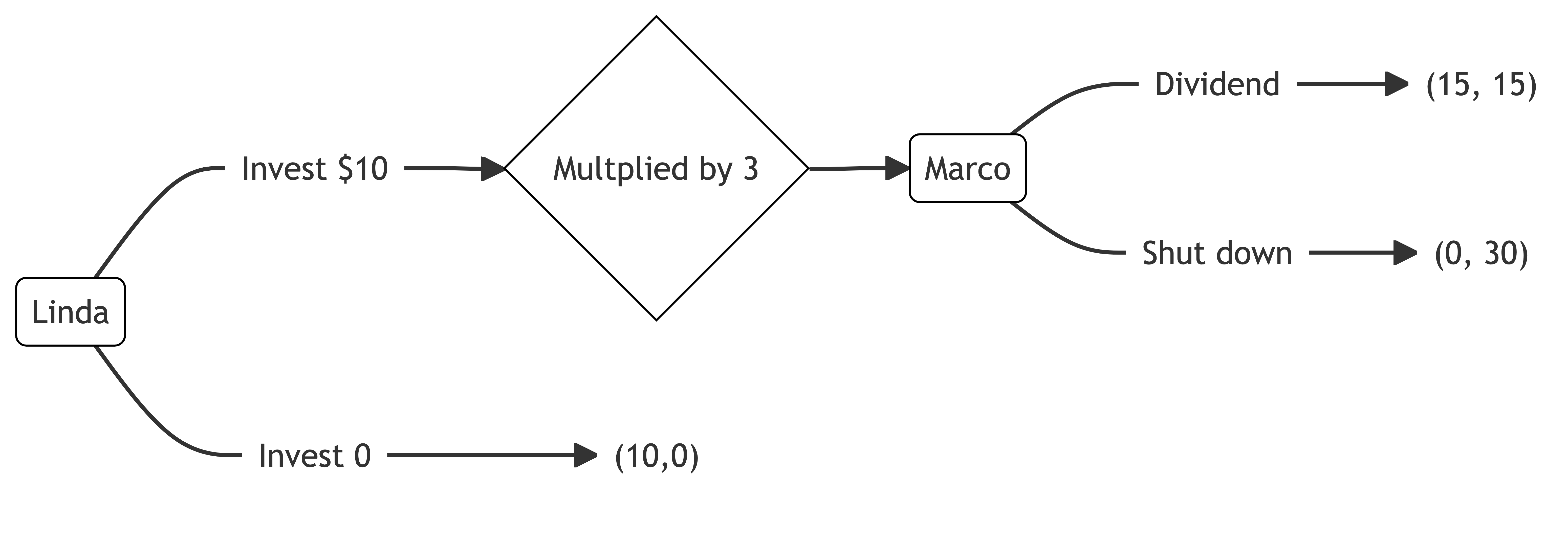 If Linda does not invest, Linda keeps the $10. The start-up gets $0.