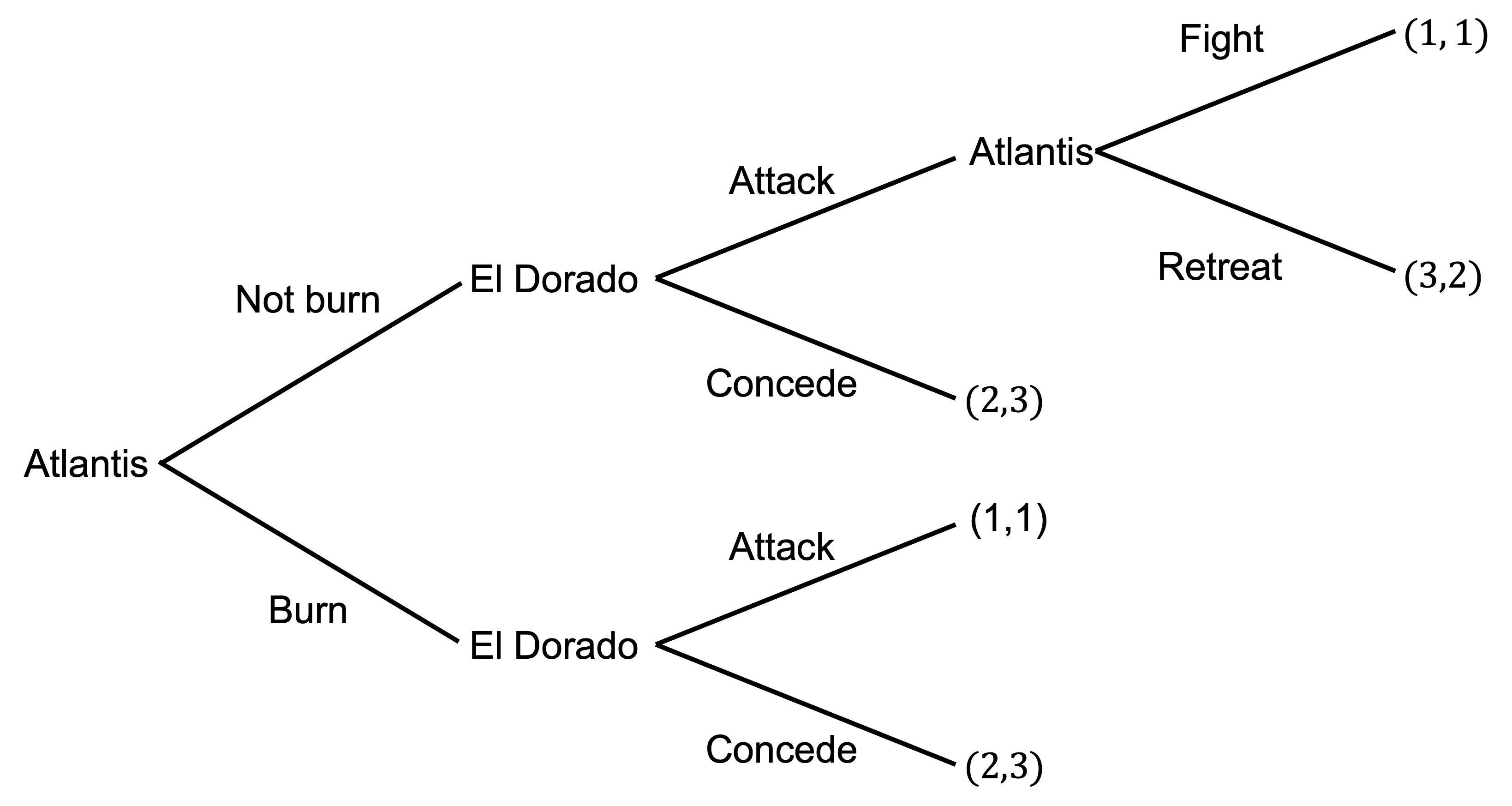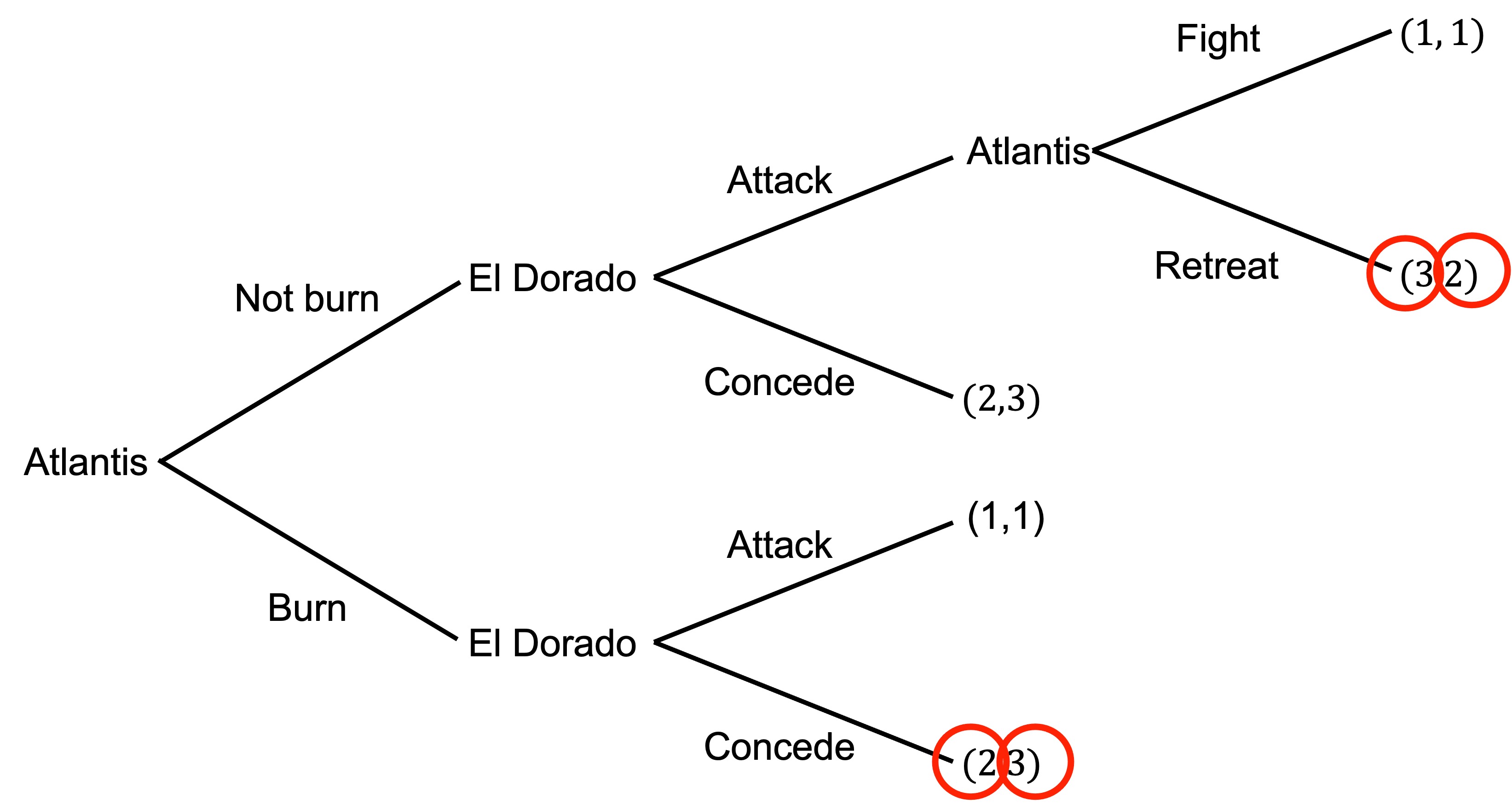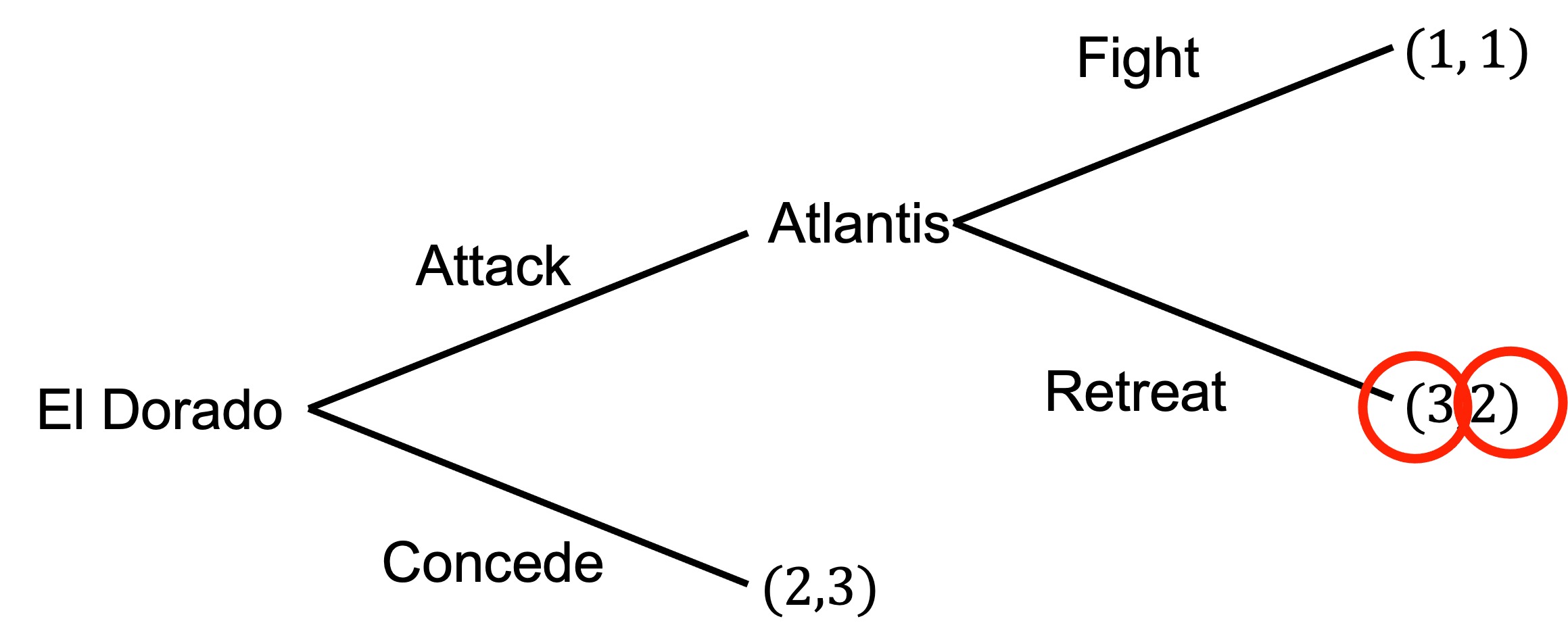 By backward induction, Atlantis would prefer to retreat (payoff of 2) compared to fighting (payoff of 1). El Dorado then has a choice between attacking (payoff of 3) and conceding (payoff of 2). El Dorado attacks.
