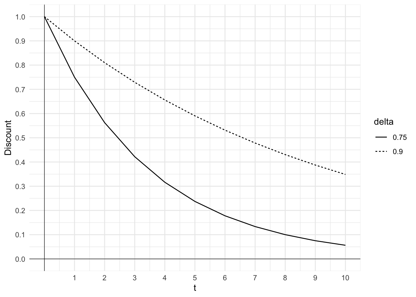 Figure 21.1 illustrates the effect of exponential discounting. The figure plots the size of the discount as a function of t for an exponential discounter with \delta=0.9 and \delta=0.75.