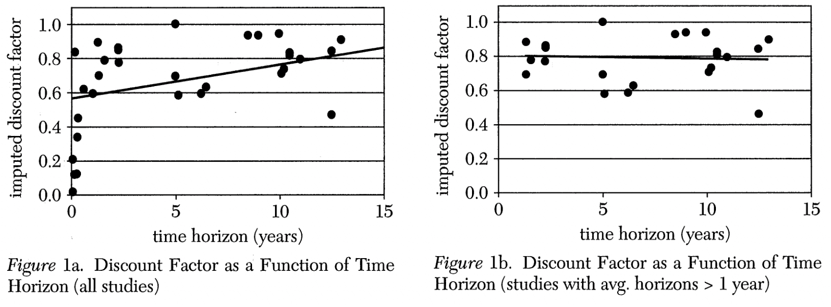 Frederick et al. (2002) plotted estimates of \delta from a set of published papers. Figure 1a shows that the estimated discount factor increases with the time horizon. If studies with horizons of one year or less are excluded, there is no relationship between the discount factor and time horizon (Figure 1b).