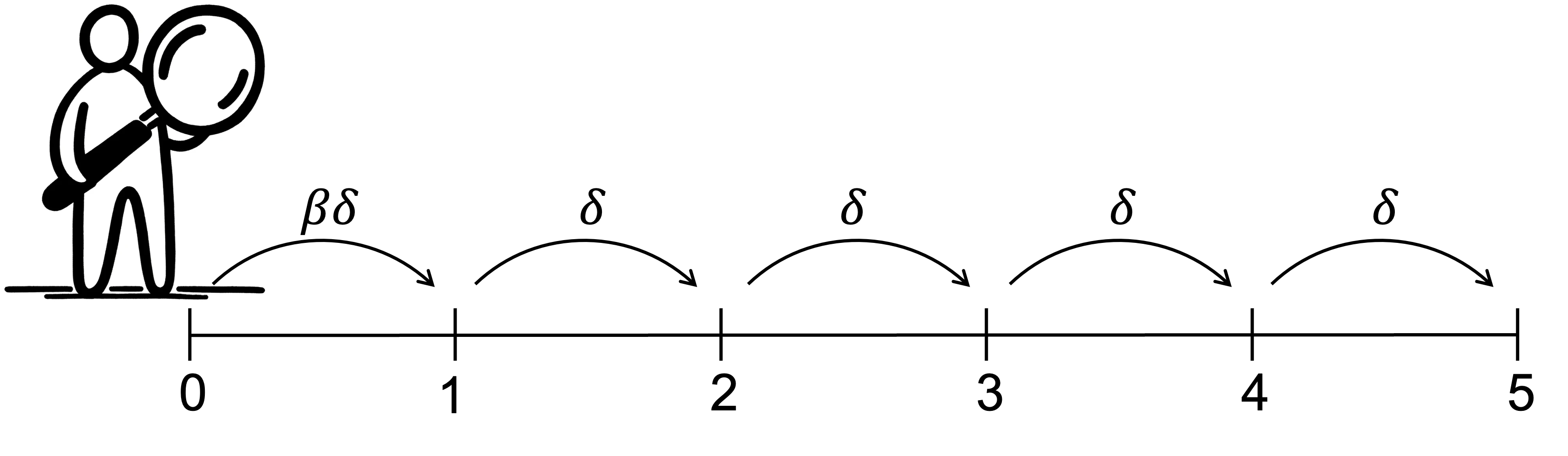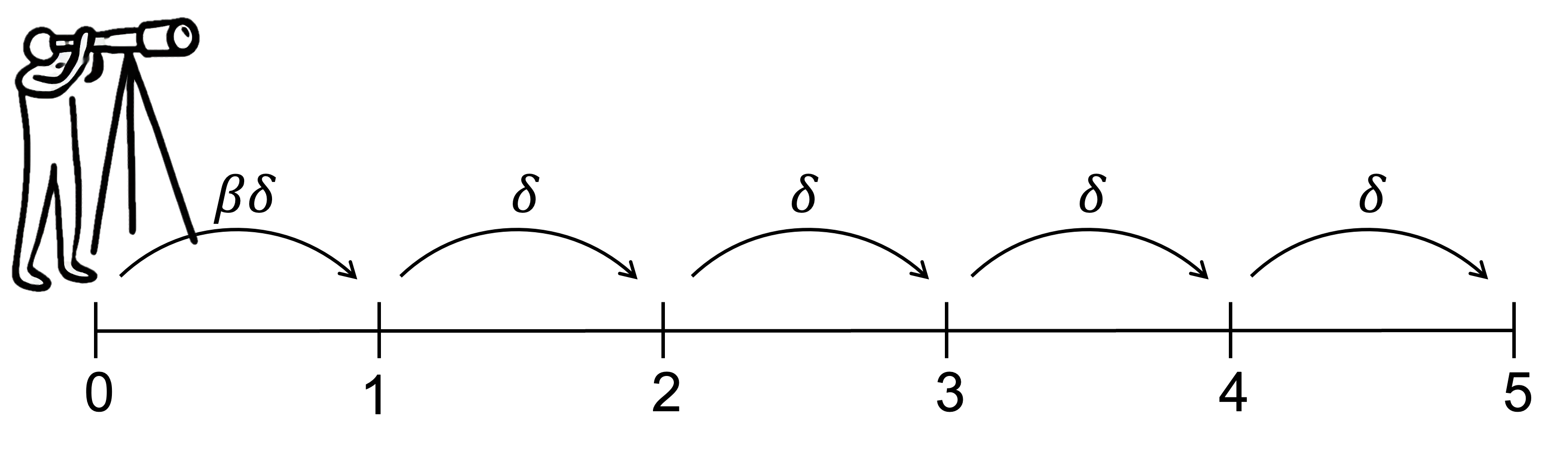 However, when period 2 does arrive, the outcome in period 3 will be discounted by both the short-term discount factor \beta and the usual discount factor \delta, compared to no discount for the outcome in period 2. As a result, the relative discount of outcomes at different times will change when one of those outcomes becomes due today.
