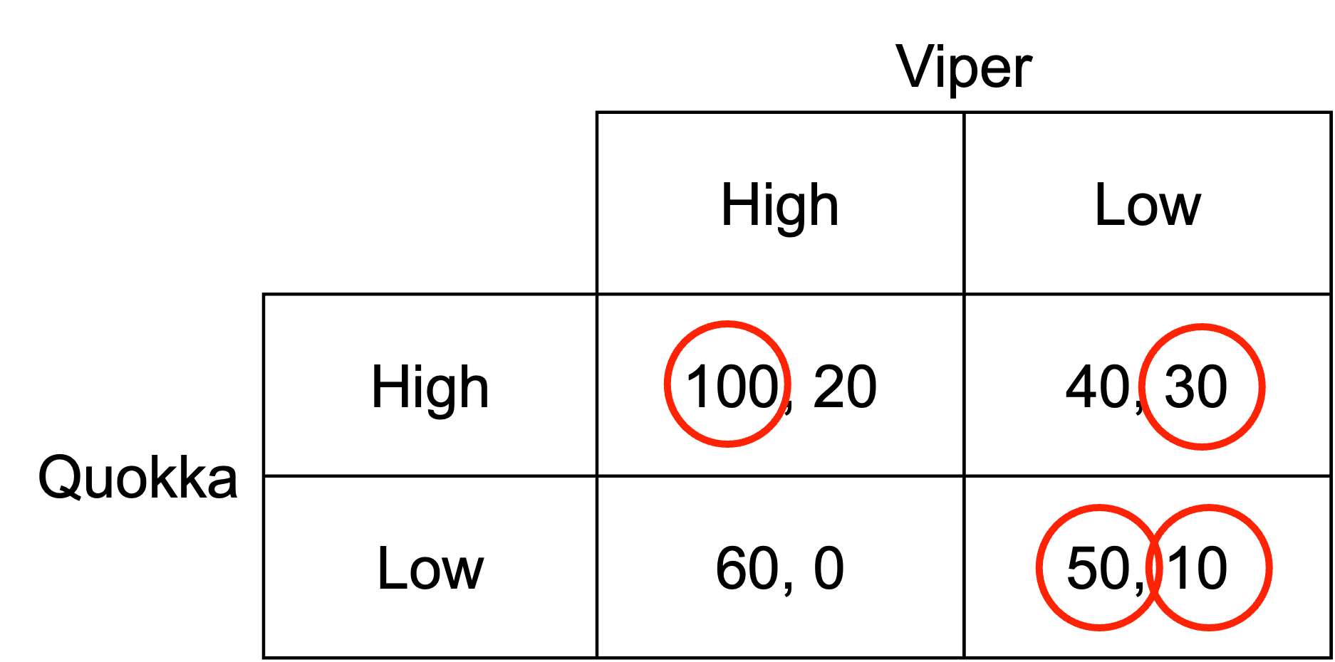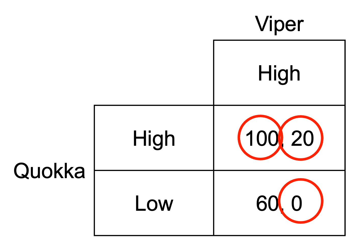If Viper sets prices high, Quokka can choose high for a payoff of 100 or low for a payoff of 60. High is the best response.