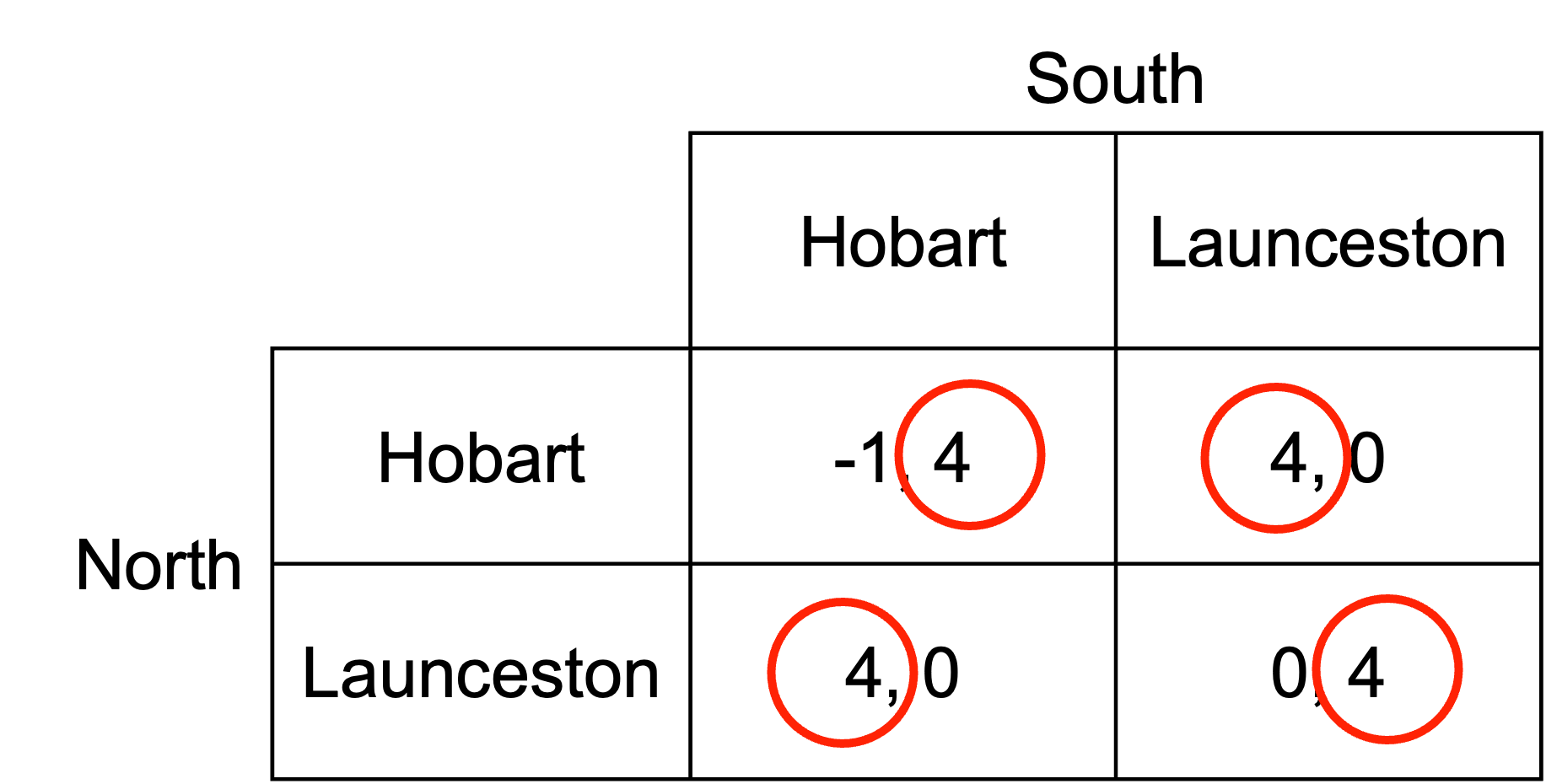 If the South defends Launceston, North can choose Hobart for a payoff of 4 or Launceston for a payoff of 0. Hobart is the best response.