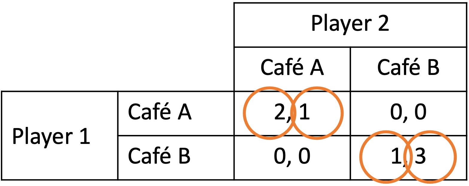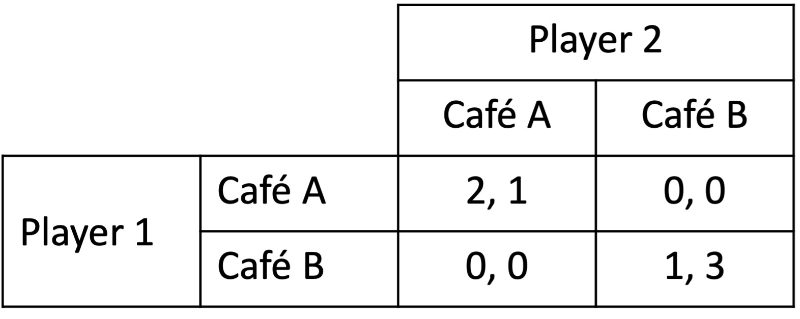Each chooses a cafe and goes there. The payoffs for each combination of choices are in the table below, with the payoffs (x, y) being the payoffs for Player 1 and Player 2 respectively.