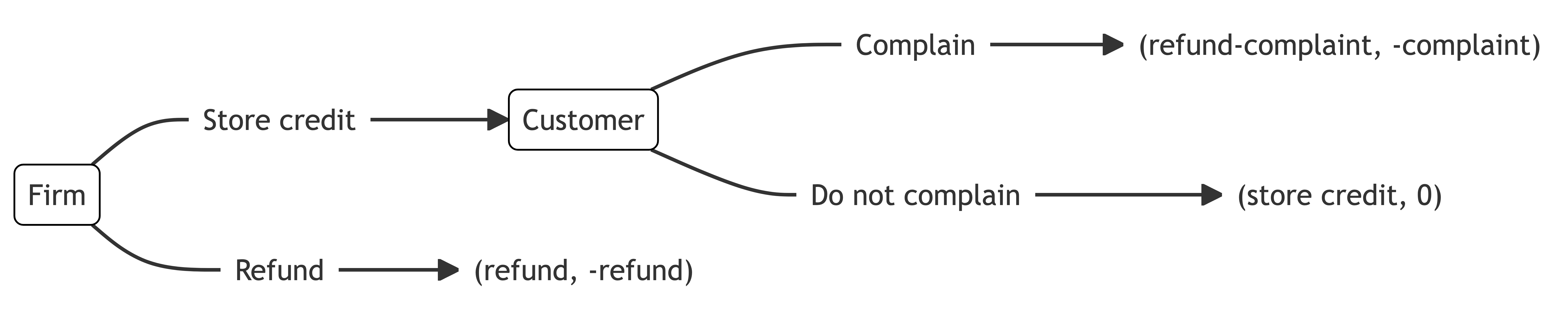 We work through this game by backward induction. If the cost to to the customer of complaining is greater than the benefit of obtaining the refund, the customer will not complain. In that case, the firm will offer the store credit.
