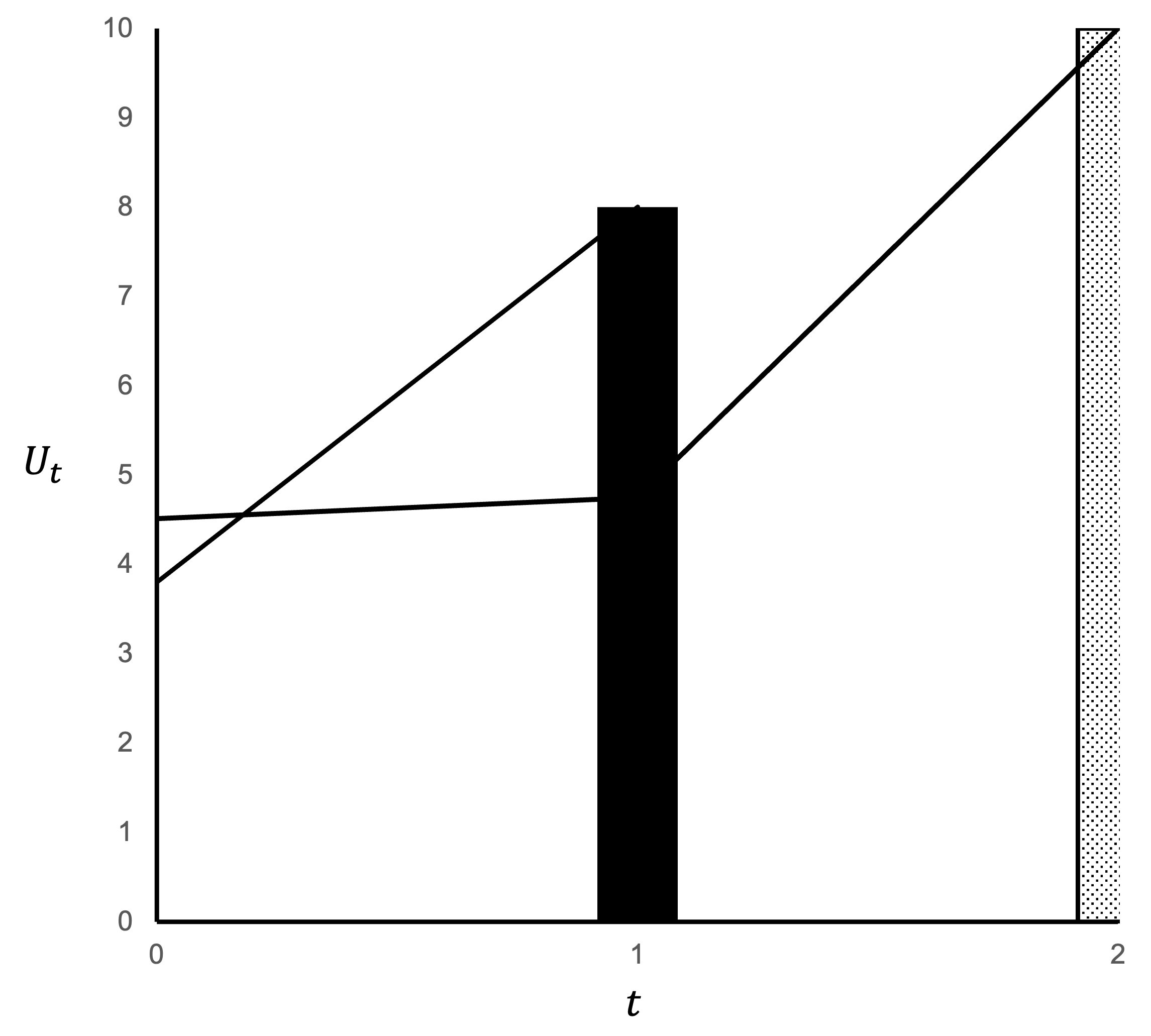 To determine what Jane chooses at t=0, Janes considers the discounted utility of the two options by backward induction.