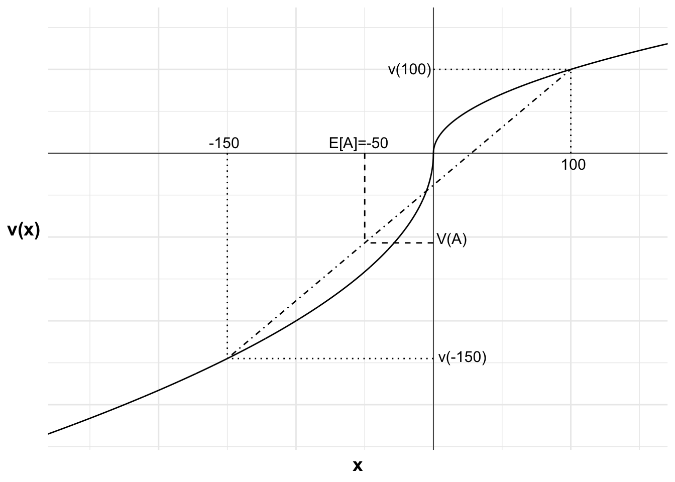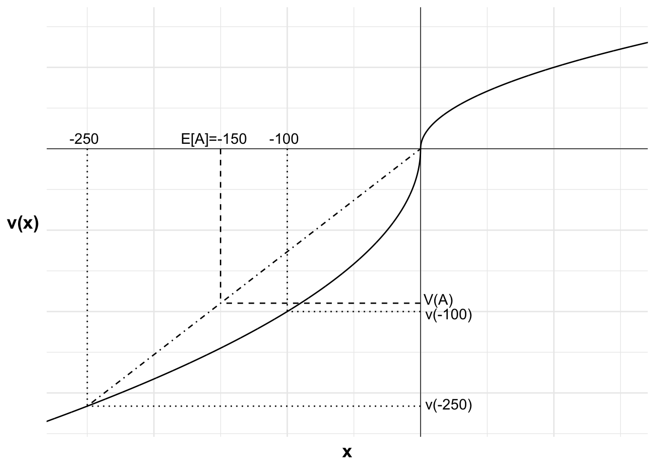 library(ggplot2)u <-function(x){ifelse (x >=0, x^0.5, -2*(-x)^0.5)}df <-data.frame(x =seq(-300, 300, 0.1),y =u(seq(-300, 300, 0.1)))#Variables for plot (may not match labels as not necessarily done to scale)#Payoffs from gamblex1<--250#lossx2<-0#winev<--150#expected value of gamblexc<--100#certain outcomepx2<-(ev-x1)/(x2-x1)ggplot(mapping =aes(x, y)) +#Plot the utility curvegeom_line(data = df) +geom_vline(xintercept =0, linewidth=0.25)+geom_hline(yintercept =0, linewidth=0.25)+labs(x ="x", y ="v(x)")+# Set the themetheme_minimal()+#remove numbers on each axistheme(axis.text.x =element_blank(),axis.text.y =element_blank(),axis.title=element_text(size=14,face="bold"),axis.title.y =element_text(angle=0, vjust=0.5))+#limit to y greater than zero and x greater than -8 (need -8 so space for y-axis labels)coord_cartesian(xlim =c(-260, 150), ylim =c(-33, 15))+#Add labels -250, v(-250) and line to curve indicating eachannotate("text", x = x1, y =0, label ="-250", size =4, hjust =0.6, vjust =-0.5)+annotate("segment", x = x1, y =0, xend = x1, yend =u(x1), linewidth =0.5, colour ="black", linetype="dotted")+annotate("segment", x =0, y =u(x1), xend = x1, yend =u(x1), linewidth =0.5, colour ="black", linetype="dotted")+annotate("text", x =0, y =u(x1), label ="v(-250)", size =4, hjust =-0.1, vjust =0.3)+#Add labels -100, v(-100) and line to curve indicating eachannotate("text", x = xc, y =0, label ="-100", size =4, hjust =0.6, vjust =-0.5)+annotate("segment", x = xc, y =0, xend = xc, yend =u(xc), linewidth =0.5, colour ="black", linetype="dotted")+annotate("segment", x =0, y =u(xc), xend = xc, yend =u(xc), linewidth =0.5, colour ="black", linetype="dotted")+annotate("text", x =0, y =u(xc), label ="v(-100)", size =4, hjust =-0.1, vjust =0.7)+#Add expected utility lineannotate("segment", x = x1, xend = x2, y =u(x1), yend =u(x2), linewidth =0.5, colour ="black", linetype="dotdash")+#Add labels 0, v(0) and line to curve indicating each#annotate("text", x = x2, y = 0, label = "0", size = 4, hjust = 0.4, vjust = 1.5)+#annotate("segment", x = x2, y = 0, xend = x2, yend = u(x2), linewidth = 0.5, colour = "black", linetype="dotted")+#annotate("segment", x = 0, y = u(x2), xend = x2, yend = u(x2), linewidth = 0.5, colour = "black", linetype="dotted")+#annotate("text", x = 0, y = u(x2), label = "v(0)", size = 4, hjust = 1.05, vjust = 0.45)+#Add labels E[A], V(A) and curve indicating eachannotate("text", x = ev, y =0, label ="E[A]=-150", size =4, hjust =0.6, vjust =-0.5)+annotate("segment", x = ev, y =0, xend = ev, yend =u(x1)+(u(x2)-u(x1))*px2, linewidth =0.5, colour ="black", linetype="dashed")+annotate("segment", x =0, y =u(x1)+(u(x2)-u(x1))*px2, xend = ev, yend =u(x1)+(u(x2)-u(x1))*px2, linewidth =0.5, colour ="black", linetype="dashed")+annotate("text", x =0, y =u(x1)+(u(x2)-u(x1))*px2, label ="V(A)", size =4, hjust =-0.1, vjust =0.1)