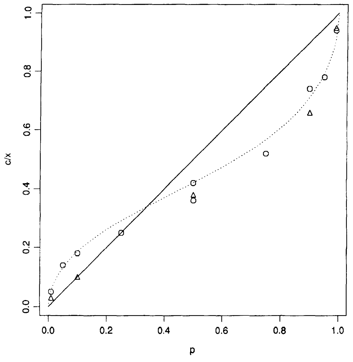 The following diagram from Tversky and Kahneman (1992) illustrates the relationship between objective probability and the decision weight applied to each outcome. On the x-axis is the probability of the outcome. On the y-axis is the weight applied to the value function for that probability. The straight line at 45 degrees represents linear weighting of probabilities. The curve represents the weighting function.