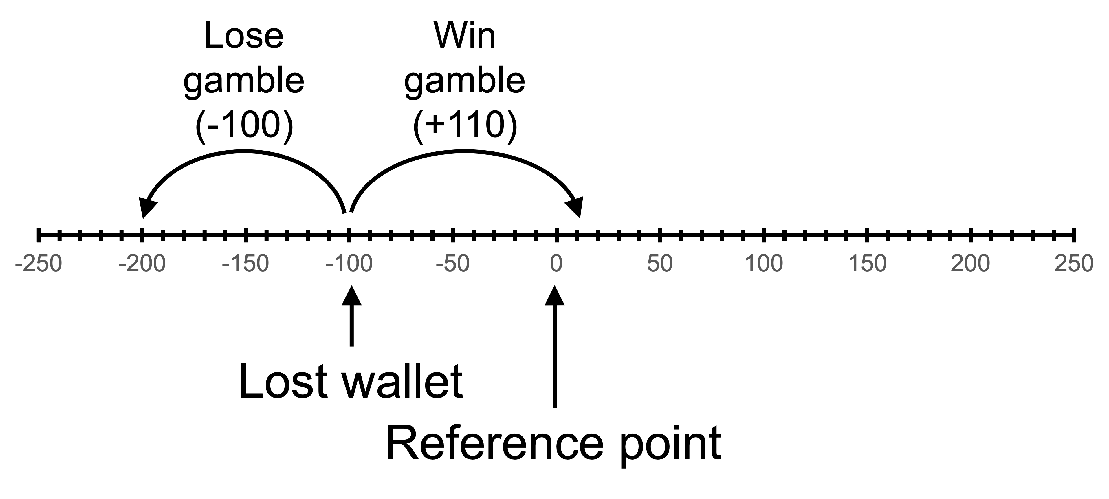 After losing $100 but not changing his reference point, he has two possible outcomes relative to his reference point: a gain of $10 (winning $110 minus the lost money in the wallet) and a loss of $200 (losing $100 and also losing his wallet).