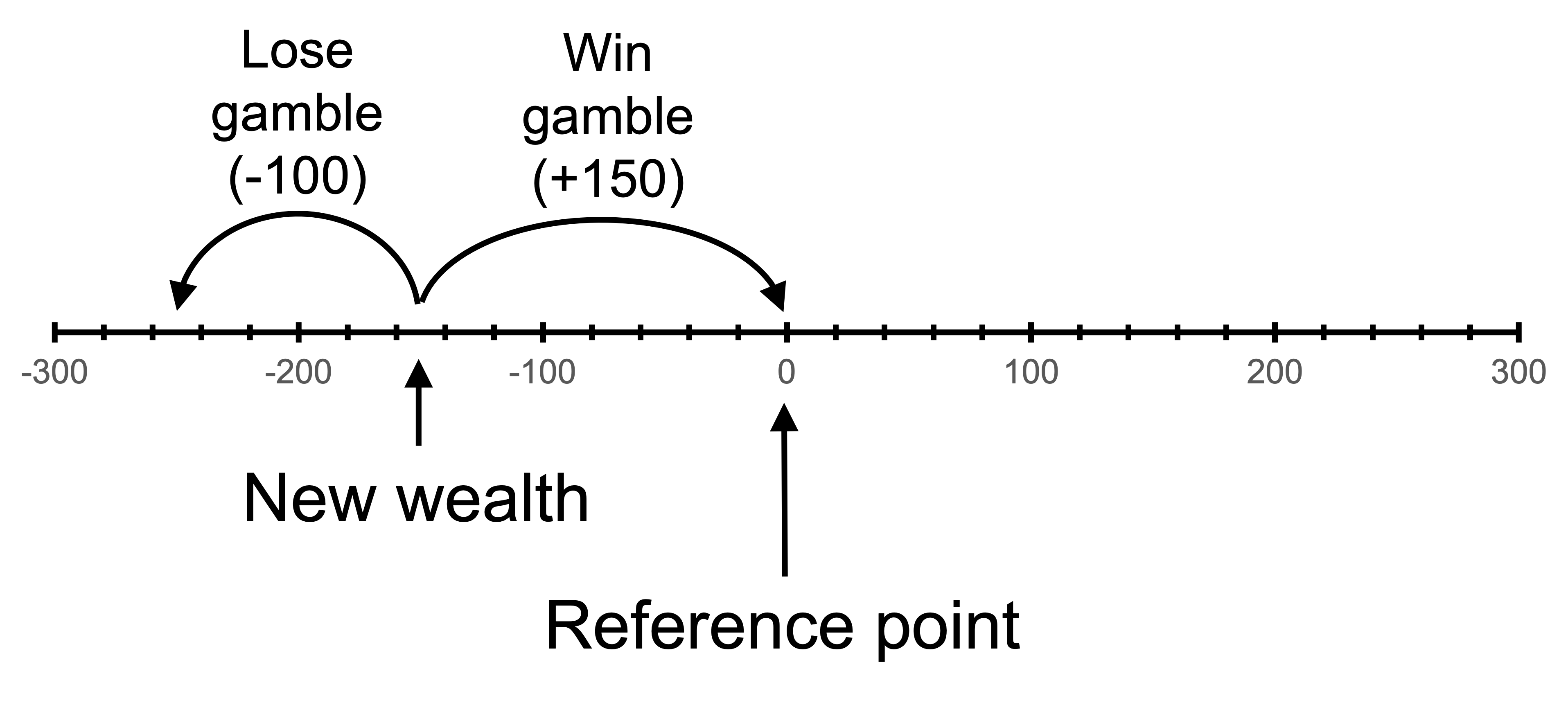 As Paddy is now in the loss domain, the two potential outcomes from the bet are a gain of $0 and a loss of $250. His alternative is remaining at a point $150 below his reference point.