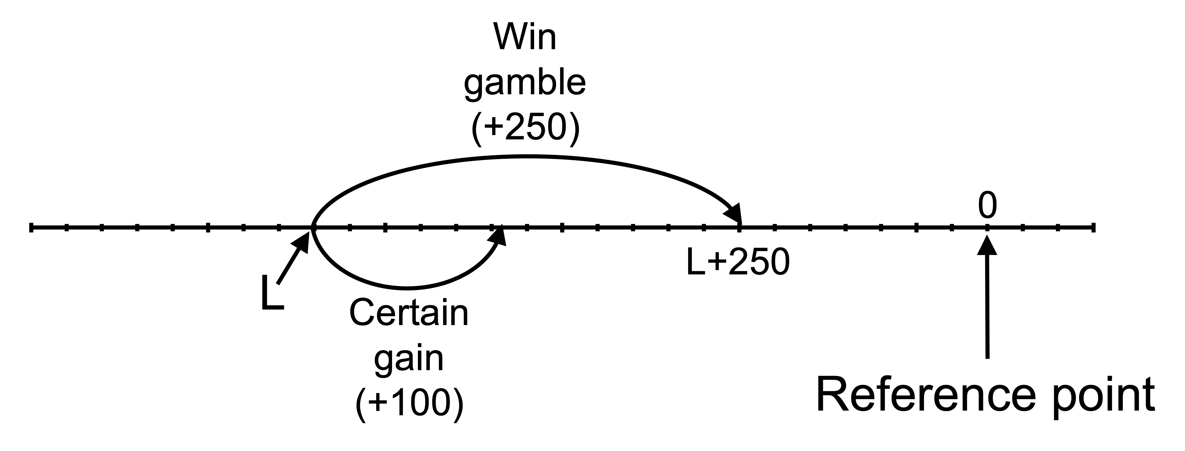 The following diagram illustrates the outcomes relative to the reference point. Let L be a large negative number, the loss. The potential outcomes from the gamble are now L and L+250. The certain outcome of accepting the $100 is L+100.