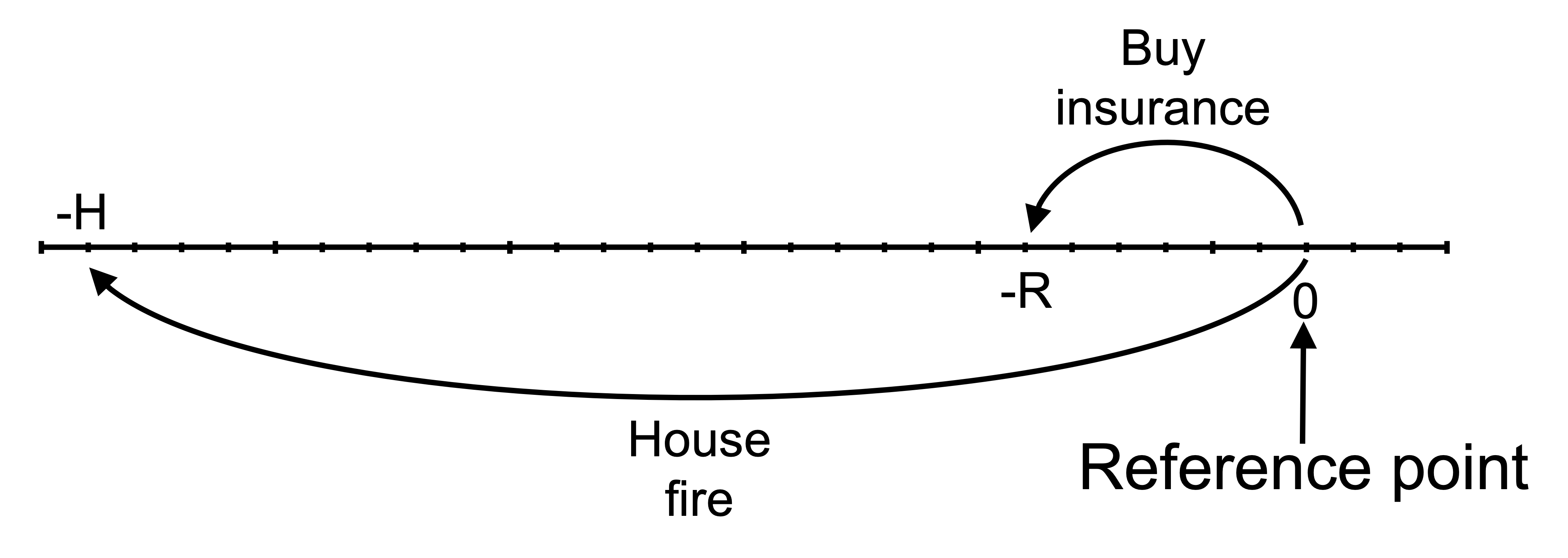 Although the diminishing feeling of loss leads to them weigh the certain loss of the premium relatively more heavily than the chance of losing the value of their house, the overweighting of the probability of fire leads them to purchase insurance. Again, if we had included loss aversion, it would not have changed the decision, as all possible outcomes are in the loss domain.