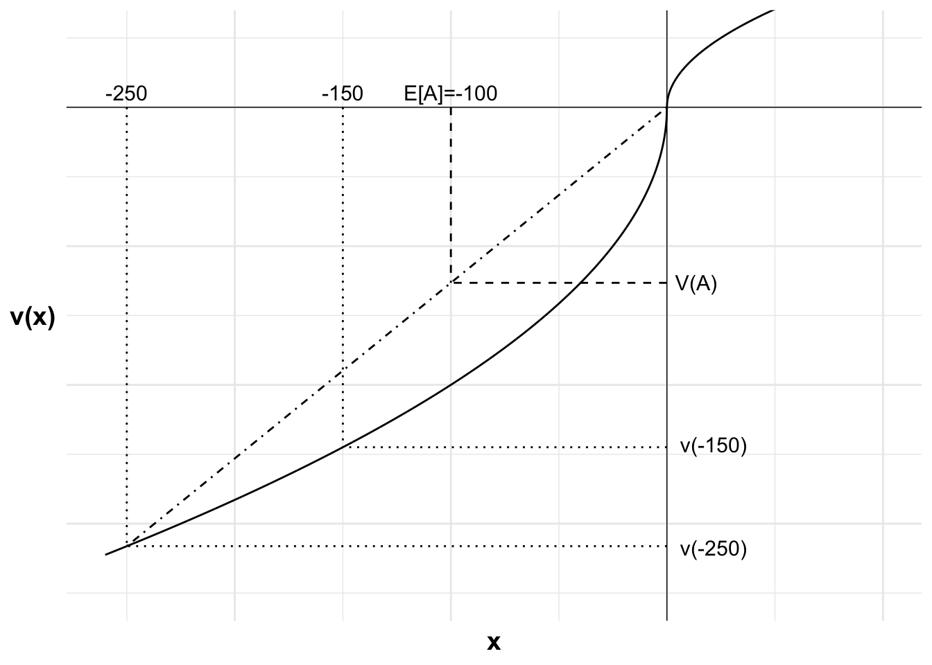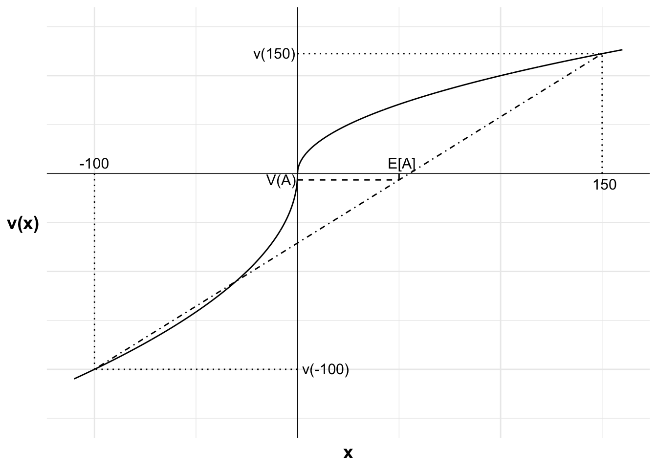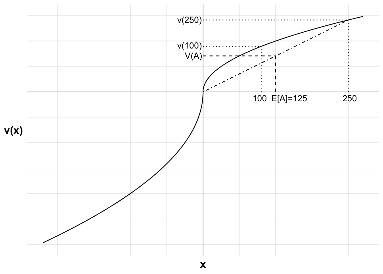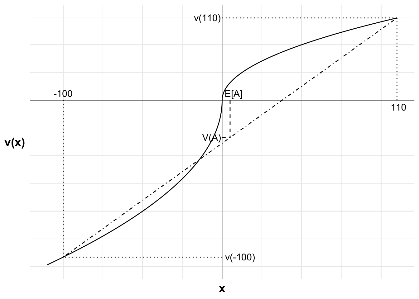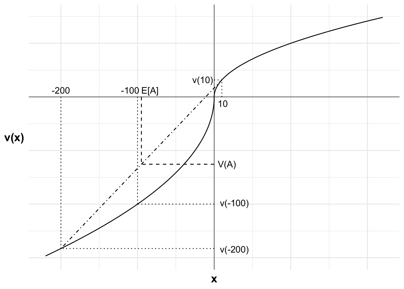 library(ggplot2)u <-function(x){ifelse (x >=0, x^0.5, -2*(-x)^0.5)}df <-data.frame(x =seq(-260, 100, 0.1),y =u(seq(-260, 100, 0.1)))#Variables for plot (may not match labels as not done to scale)#Payoffs from gamblex1 <--250#lossx2 <-0#winev <--100#expected value of gamblexc <--150#certain outcomepx2<-(ev-x1)/(x2-x1)ggplot(mapping =aes(x, y)) +#Plot the utility curvegeom_line(data = df) +geom_vline(xintercept =0, linewidth=0.25)+geom_hline(yintercept =0, linewidth=0.25)+labs(x ="x", y ="v(x)")+# Set the themetheme_minimal()+#remove numbers on each axistheme(axis.text.x =element_blank(),axis.text.y =element_blank(),axis.title=element_text(size=14,face="bold"),axis.title.y =element_text(angle=0, vjust=0.5))+#limit to y greater than zero and x greater than -8 (need -8 so space for y-axis labels)coord_cartesian(xlim =c(-260, 100), ylim =c(-35, 5))+#Add labels -250, v(-250) and line to curve indicating eachannotate("text", x = x1, y =0, label ="-250", size =4, hjust =0.5, vjust =-0.5)+annotate("segment", x = x1, y =0, xend = x1, yend =u(x1), linewidth =0.5, colour ="black", linetype="dotted")+annotate("segment", x =0, y =u(x1), xend = x1, yend =u(x1), linewidth =0.5, colour ="black", linetype="dotted")+annotate("text", x =0, y =u(x1), label ="v(-250)", size =4, hjust =-0.2, vjust =0.6)+#Add labels -150, v(-150) and line to curve indicating eachannotate("text", x = xc, y =0, label ="-150", size =4, hjust =0.5, vjust =-0.5)+annotate("segment", x = xc, y =0, xend = xc, yend =u(xc), linewidth =0.5, colour ="black", linetype="dotted")+annotate("segment", x =0, y =u(xc), xend = xc, yend =u(xc), linewidth =0.5, colour ="black", linetype="dotted")+annotate("text", x =0, y =u(xc), label ="v(-150)", size =4, hjust =-0.2, vjust =0.3)+#Add expected utility lineannotate("segment", x = x1, xend = x2, y =u(x1), yend =u(x2), linewidth =0.5, colour ="black", linetype="dotdash")+#Add labels E[A]=-100, V(A) and curve indicating eachannotate("text", x = ev, y =0, label ="E[A]=-100", size =4, hjust =0.5, vjust =-0.5)+annotate("segment", x = ev, y =0, xend = ev, yend =u(x1)+(u(x2)-u(x1))*px2, linewidth =0.5, colour ="black", linetype="dashed")+annotate("segment", x =0, y =u(x1)+(u(x2)-u(x1))*px2, xend = ev, yend =u(x1)+(u(x2)-u(x1))*px2, linewidth =0.5, colour ="black", linetype="dashed")+annotate("text", x =0, y =u(x1)+(u(x2)-u(x1))*px2, label ="V(A)", size =4, hjust =-0.2, vjust =0.45)