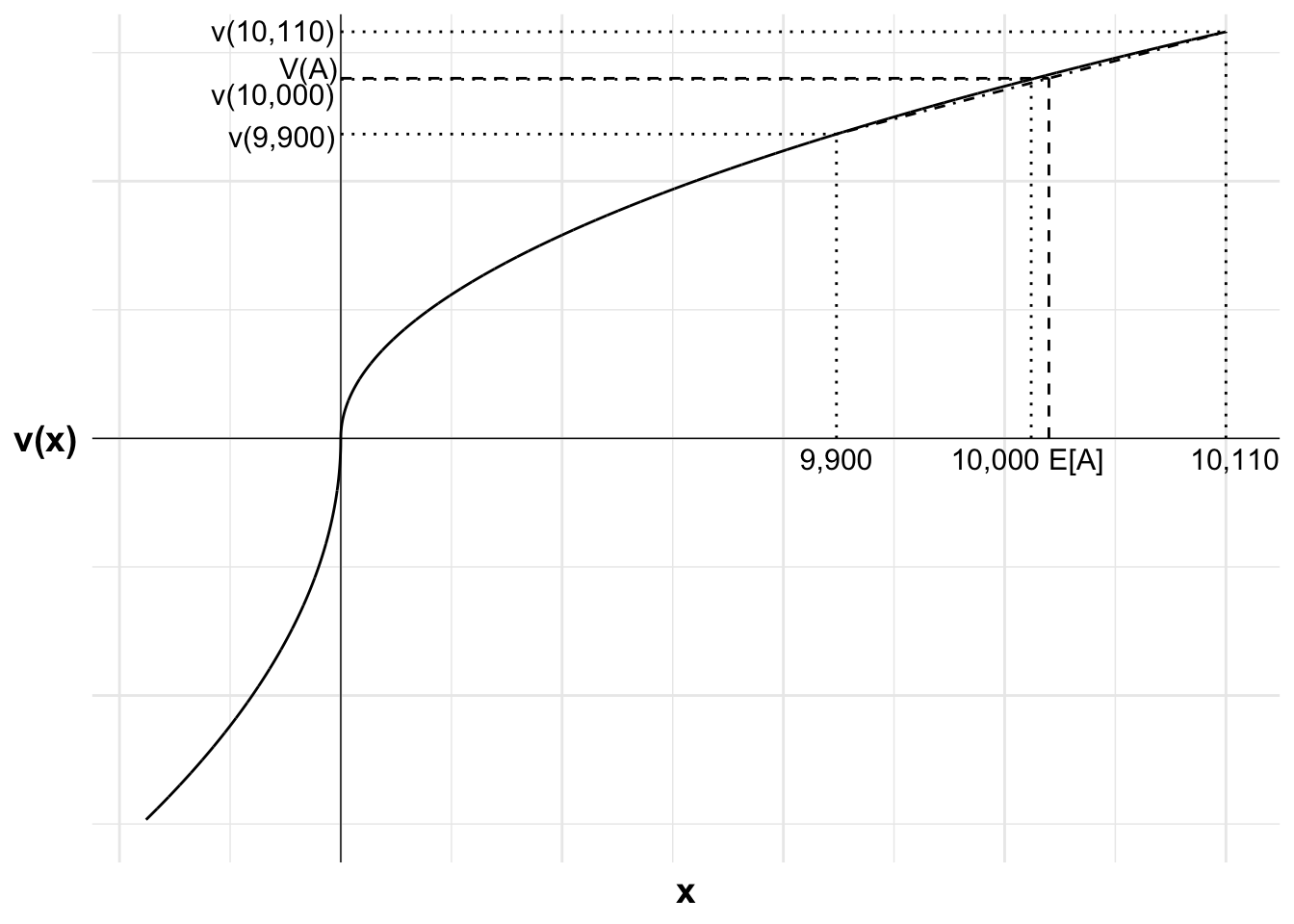 library(ggplot2)u <-function(x){ifelse (x >=0, x^0.5, -2*(-x)^0.5)}df <-data.frame(x =seq(-220, 1000, 0.1),y =u(seq(-220, 1000, 0.1)))#Variables for plot (may not match labels as not done to scale)#Payoffs from gamblex1 <-560#lossx2 <-1000#winev <-800#expected value of gamblexc <-780#certain outcomepx2<-(ev-x1)/(x2-x1)ggplot(mapping =aes(x, y)) +#Plot the utility curvegeom_line(data = df) +geom_vline(xintercept =0, linewidth=0.25)+geom_hline(yintercept =0, linewidth=0.25)+labs(x ="x", y ="v(x)")+# Set the themetheme_minimal()+#remove numbers on each axistheme(axis.text.x =element_blank(),axis.text.y =element_blank(),axis.title=element_text(size=14,face="bold"),axis.title.y =element_text(angle=0, vjust=0.5))+#limit to y greater than zero and x greater than -8 (need -8 so space for y-axis labels)coord_cartesian(xlim =c(-220, 1000), ylim =c(-30, 30))+#Add labels 9,900, v(9,900) and line to curve indicating eachannotate("text", x = x1, y =0, label ="9,900", size =4, hjust =0.5, vjust =1.5)+annotate("segment", x = x1, y =0, xend = x1, yend =u(x1), linewidth =0.5, colour ="black", linetype="dotted")+annotate("segment", x =0, y =u(x1), xend = x1, yend =u(x1), linewidth =0.5, colour ="black", linetype="dotted")+annotate("text", x =0, y =u(x1), label ="v(9,900)", size =4, hjust =1.05, vjust =0.6)+#Add labels 10,000, v(10,000) and line to curve indicating eachannotate("text", x = xc, y =0, label ="10,000", size =4, hjust =0.9, vjust =1.5)+annotate("segment", x = xc, y =0, xend = xc, yend =u(xc), linewidth =0.5, colour ="black", linetype="dotted")+annotate("segment", x =0, y =u(xc), xend = xc, yend =u(xc), linewidth =0.5, colour ="black", linetype="dotted")+annotate("text", x =0, y =u(xc), label ="v(10,000)", size =4, hjust =1.05, vjust =1.2)+#Add expected utility lineannotate("segment", x = x1, xend = x2, y =u(x1), yend =u(x2), linewidth =0.5, colour ="black", linetype="dotdash")+#Add labels 10,110, v(10,110) and line to curve indicating eachannotate("text", x = x2, y =0, label ="10,110", size =4, hjust =0.4, vjust =1.5)+annotate("segment", x = x2, y =0, xend = x2, yend =u(x2), linewidth =0.5, colour ="black", linetype="dotted")+annotate("segment", x =0, y =u(x2), xend = x2, yend =u(x2), linewidth =0.5, colour ="black", linetype="dotted")+annotate("text", x =0, y =u(x2), label ="v(10,110)", size =4, hjust =1.05, vjust =0.45)+#Add labels E[A], V(A) and curve indicating eachannotate("text", x = ev, y =0, label ="E[A]", size =4, hjust =0, vjust =1.5)+annotate("segment", x = ev, y =0, xend = ev, yend =u(x1)+(u(x2)-u(x1))*px2, linewidth =0.5, colour ="black", linetype="dashed")+annotate("segment", x =0, y =u(x1)+(u(x2)-u(x1))*px2, xend = ev, yend =u(x1)+(u(x2)-u(x1))*px2, linewidth =0.5, colour ="black", linetype="dashed")+annotate("text", x =0, y =u(x1)+(u(x2)-u(x1))*px2, label ="V(A)", size =4, hjust =1.05, vjust =0)