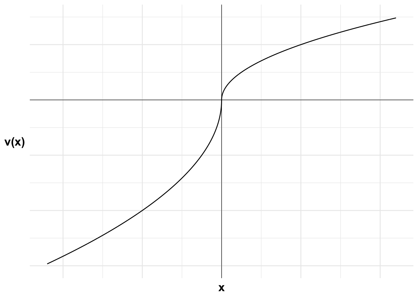 library(ggplot2)u <-function(x){ifelse (x >=0, x^0.5, -2*(-x)^0.5)}df <-data.frame(x =seq(-220, 220, 0.1),y =u(seq(-220, 220, 0.1)))ggplot(mapping =aes(x, y)) +#Plot the utility curvegeom_line(data = df) +geom_vline(xintercept =0, linewidth=0.25)+geom_hline(yintercept =0, linewidth=0.25)+labs(x ="x", y ="v(x)")+# Set the themetheme_minimal()+#remove numbers on each axistheme(axis.text.x =element_blank(),axis.text.y =element_blank(),axis.title=element_text(size=14,face="bold"),axis.title.y =element_text(angle=0, vjust=0.5))+#limit to y greater than zero and x greater than -8 (need -8 so space for y-axis labels)coord_cartesian(xlim =c(-220, 220), ylim =c(-30, 15))