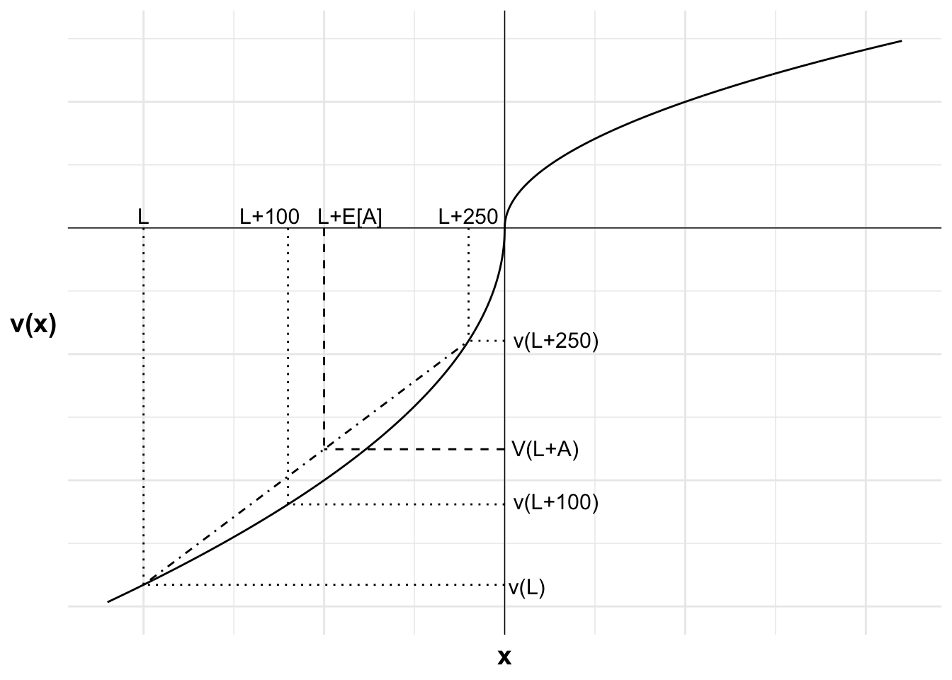 library(ggplot2)u <-function(x){ifelse (x >=0, x^0.5, -2*(-x)^0.5)}df <-data.frame(x =seq(-220, 220, 0.1),y =u(seq(-220, 220, 0.1)))#Variables for plot (may not match labels as not done to scale)#Payoffs from gamblex1<--200#lossx2<--20#winev<--100#expected value of gamblexc<--120#certain outcomepx2<-(ev-x1)/(x2-x1)ggplot(mapping =aes(x, y)) +#Plot the utility curvegeom_line(data = df) +geom_vline(xintercept =0, linewidth=0.25)+geom_hline(yintercept =0, linewidth=0.25)+labs(x ="x", y ="v(x)")+# Set the themetheme_minimal()+#remove numbers on each axistheme(axis.text.x =element_blank(),axis.text.y =element_blank(),axis.title=element_text(size=14,face="bold"),axis.title.y =element_text(angle=0, vjust=0.5))+#limit to y greater than zero and x greater than -8 (need -8 so space for y-axis labels)coord_cartesian(xlim =c(-220, 220), ylim =c(-30, 15))+#Add labels L, v(L) and line to curve indicating eachannotate("text", x = x1, y =0, label ="L", size =4, hjust =0.5, vjust =-0.3)+annotate("segment", x = x1, y =0, xend = x1, yend =u(x1), linewidth =0.5, colour ="black", linetype="dotted")+annotate("segment", x =0, y =u(x1), xend = x1, yend =u(x1), linewidth =0.5, colour ="black", linetype="dotted")+annotate("text", x =0, y =u(x1), label ="v(L)", size =4, hjust =-0.1, vjust =0.6)+#Add labels L+100, v(L+100) and line to curve indicating eachannotate("text", x = xc, y =0, label ="L+100", size =4, hjust =0.8, vjust =-0.3)+annotate("segment", x = xc, y =0, xend = xc, yend =u(xc), linewidth =0.5, colour ="black", linetype="dotted")+annotate("segment", x =0, y =u(xc), xend = xc, yend =u(xc), linewidth =0.5, colour ="black", linetype="dotted")+annotate("text", x =0, y =u(xc), label ="v(L+100)", size =4, hjust =-0.1, vjust =0.3)+#Add expected utility lineannotate("segment", x = x1, xend = x2, y =u(x1), yend =u(x2), linewidth =0.5, colour ="black", linetype="dotdash")+#Add labels 250+L, U(250+L) and line to curve indicating eachannotate("text", x = x2, y =0, label ="L+250", size =4, hjust =0.5, vjust =-0.3)+annotate("segment", x = x2, y =0, xend = x2, yend =u(x2), linewidth =0.5, colour ="black", linetype="dotted")+annotate("segment", x =0, y =u(x2), xend = x2, yend =u(x2), linewidth =0.5, colour ="black", linetype="dotted")+annotate("text", x =0, y =u(x2), label ="v(L+250)", size =4, hjust =-0.1, vjust =0.45)+#Add labels L+E[A], v(A+L) and curve indicating eachannotate("text", x = ev, y =0, label ="L+E[A]", size =4, hjust =0.1, vjust =-0.3)+annotate("segment", x = ev, y =0, xend = ev, yend =u(x1)+(u(x2)-u(x1))*px2, linewidth =0.5, colour ="black", linetype="dashed")+annotate("segment", x =0, y =u(x1)+(u(x2)-u(x1))*px2, xend = ev, yend =u(x1)+(u(x2)-u(x1))*px2, linewidth =0.5, colour ="black", linetype="dashed")+annotate("text", x =0, y =u(x1)+(u(x2)-u(x1))*px2, label ="V(L+A)", size =4, hjust =-0.1, vjust =0.45)