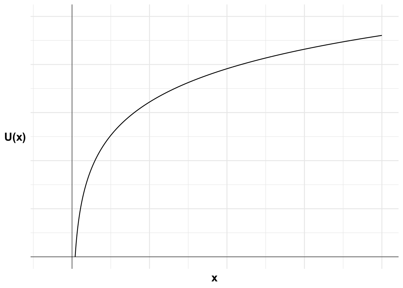 library(ggplot2)library(latex2exp)u <-function(x){log(x)}df <-data.frame(x=seq(1,100,0.1),y=NA)df$y <-u(df$x)#Variables for plot (may not match labels as not done to scale)#Payoffs from gamblex1<-3#lossx2<-90#winev<-77#expected value of gamblexc<-70#certain outcomepx2<-(ev-x1)/(x2-x1)insurance_eu_1 <-ggplot(mapping =aes(x, y)) +geom_line(data = df) +geom_vline(xintercept =0, linewidth=0.25)+geom_hline(yintercept =0, linewidth=0.25)+labs(x ="x", y ="U(x)")+# Set the themetheme_minimal()+#remove numbers on each axistheme(axis.text.x =element_blank(),axis.text.y =element_blank(),axis.title=element_text(size=14,face="bold"),axis.title.y =element_text(angle=0, vjust=0.5))+#limit to y greater than zero and x greater than -8 (need -8 so space for y-axis labels)coord_cartesian(xlim =c(-8, 100), ylim =c(0, 5))insurance_eu_1