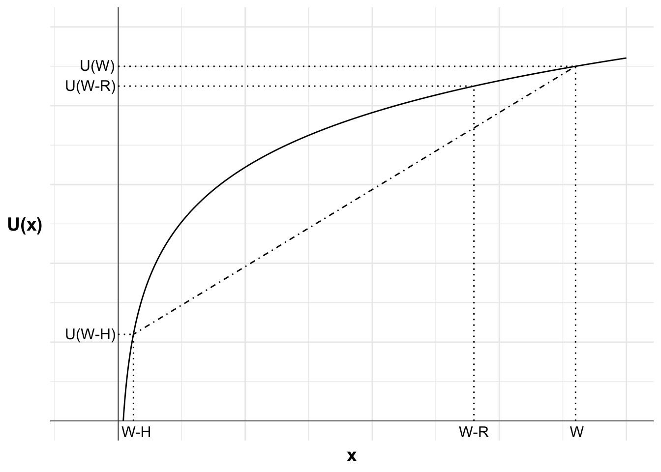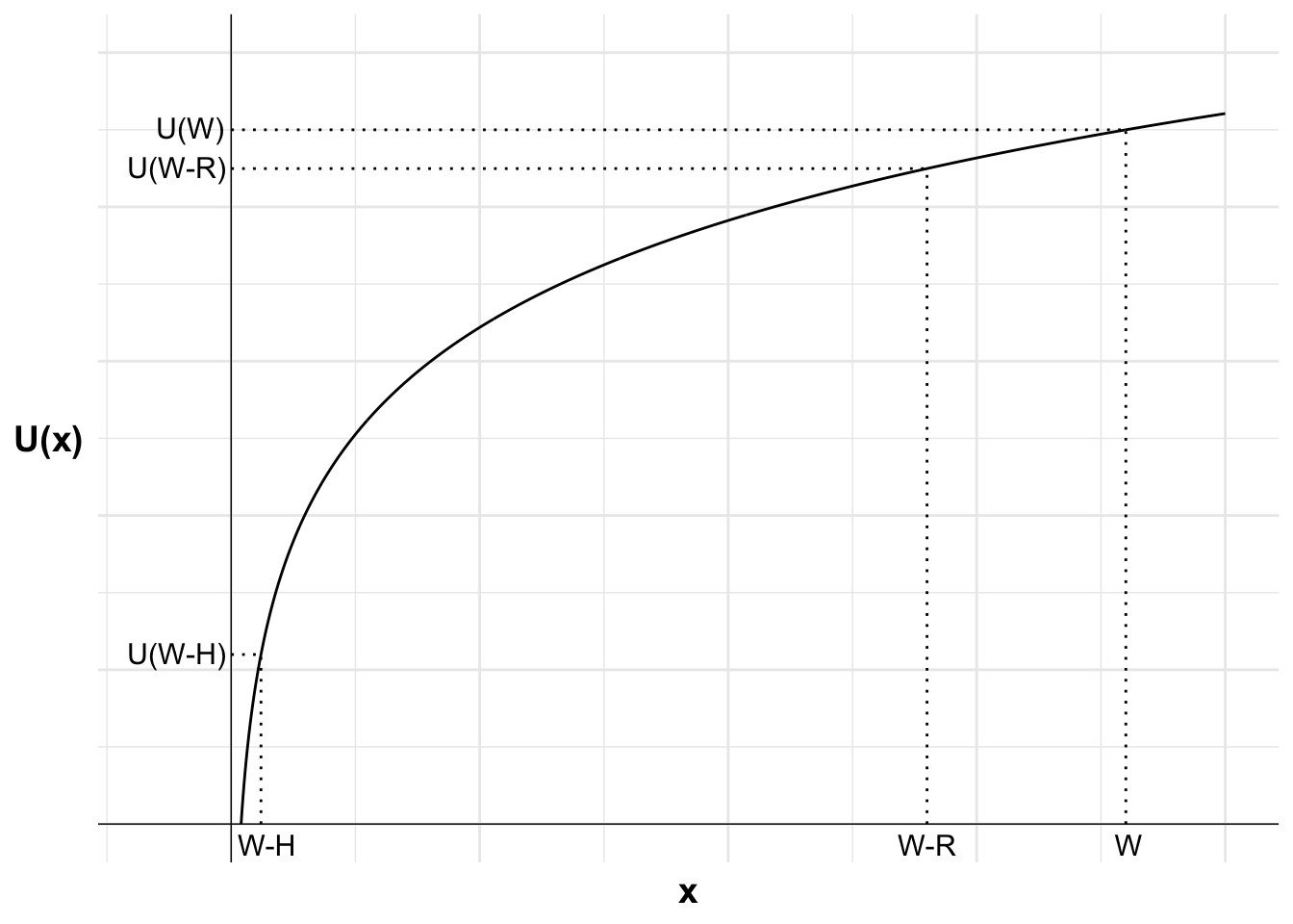 library(ggplot2)library(latex2exp)u <-function(x){log(x)}df <-data.frame(x=seq(1,100,0.1),y=NA)df$y <-u(df$x)#Variables for plot (may not match labels as not done to scale)#Payoffs from gamblex1<-3#lossx2<-90#winev<-77#expected value of gamblexc<-70#certain outcomepx2<-(ev-x1)/(x2-x1)insurance_eu_2 <- insurance_eu_1 +#Add labels W, U(W) and line to curve indicating eachannotate("text", x = x2, y =0, label ="W", size =4, hjust =0.4, vjust =1.5)+annotate("segment", x = x2, y =0, xend = x2, yend =u(x2), linewidth =0.5, colour ="black", linetype="dotted")+annotate("segment", x =0, y =u(x2), xend = x2, yend =u(x2), linewidth =0.5, colour ="black", linetype="dotted")+annotate("text", x =0, y =u(x2), label ="U(W)", size =4, hjust =1.1, vjust =0.4)+#Add labels W-R, U(W_R) and line to curve indicating eachannotate("text", x = xc, y =0, label ="W-R", size =4, hjust =0.5, vjust =1.5)+annotate("segment", x = xc, y =0, xend = xc, yend =u(xc), linewidth =0.5, colour ="black", linetype="dotted")+annotate("segment", x =0, y =u(xc), xend = xc, yend =u(xc), linewidth =0.5, colour ="black", linetype="dotted")+annotate("text", x =0, y =u(xc), label ="U(W-R)", size =4, hjust =1.05, vjust =0.45)+#Add labels W-H, U(W-H) and line to curve indicating eachannotate("text", x = x1, y =0, label ="W-H", size =4, hjust =0.4, vjust =1.5)+annotate("segment", x = x1, y =0, xend = x1, yend =u(x1), linewidth =0.5, colour ="black", linetype="dotted")+annotate("segment", x =0, y =u(x1), xend = x1, yend =u(x1), linewidth =0.5, colour ="black", linetype="dotted")+annotate("text", x =0, y =u(x1), label ="U(W-H)", size =4, hjust =1.05, vjust =0.45)insurance_eu_2