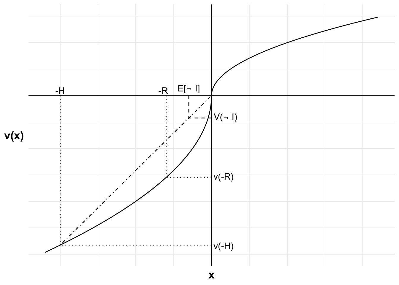 library(ggplot2)u <-function(x){ifelse (x >=0, x^0.5, -2*(-x)^0.5)}df <-data.frame(x =seq(-220, 220, 0.1),y =u(seq(-220, 220, 0.1)))#Variables for plot (may not match labels as not done to scale)#Payoffs from gamblex1<--200#lossx2<-0#winev<--30#expected value of gamblexc<--60#certain outcomepx2<-(ev-x1)/(x2-x1)ggplot(mapping =aes(x, y)) +#Plot the utility curvegeom_line(data = df) +geom_vline(xintercept =0, linewidth=0.25)+geom_hline(yintercept =0, linewidth=0.25)+labs(x ="x", y ="v(x)")+# Set the themetheme_minimal()+#remove numbers on each axistheme(axis.text.x =element_blank(),axis.text.y =element_blank(),axis.title=element_text(size=14,face="bold"),axis.title.y =element_text(angle=0, vjust=0.5))+#limit to y greater than zero and x greater than -8 (need -8 so space for y-axis labels)coord_cartesian(xlim =c(-220, 220), ylim =c(-30, 15))+#Add labels -H, v(L) and line to curve indicating eachannotate("text", x = x1, y =0, label ="-H", size =4, hjust =0.5, vjust =-0.3)+annotate("segment", x = x1, y =0, xend = x1, yend =u(x1), linewidth =0.5, colour ="black", linetype="dotted")+annotate("segment", x =0, y =u(x1), xend = x1, yend =u(x1), linewidth =0.5, colour ="black", linetype="dotted")+annotate("text", x =0, y =u(x1), label ="v(-H)", size =4, hjust =-0.1, vjust =0.6)+#Add labels -R, v(-R) and line to curve indicating eachannotate("text", x = xc, y =0, label ="-R", size =4, hjust =0.8, vjust =-0.3)+annotate("segment", x = xc, y =0, xend = xc, yend =u(xc), linewidth =0.5, colour ="black", linetype="dotted")+annotate("segment", x =0, y =u(xc), xend = xc, yend =u(xc), linewidth =0.5, colour ="black", linetype="dotted")+annotate("text", x =0, y =u(xc), label ="v(-R)", size =4, hjust =-0.1, vjust =0.3)+#Add expected utility lineannotate("segment", x = x1, xend = x2, y =u(x1), yend =u(x2), linewidth =0.5, colour ="black", linetype="dotdash")+#Add labels E[\neg I], V(\neg I) and curve indicating eachannotate("text", x = ev, y =0, label =as.character(TeX("E[$\\neg$ I]")), size =4, hjust =0.5, vjust =-0.3, parse=TRUE)+annotate("segment", x = ev, y =0, xend = ev, yend =u(x1)+(u(x2)-u(x1))*px2, linewidth =0.5, colour ="black", linetype="dashed")+annotate("segment", x =0, y =u(x1)+(u(x2)-u(x1))*px2, xend = ev, yend =u(x1)+(u(x2)-u(x1))*px2, linewidth =0.5, colour ="black", linetype="dashed")+annotate("text", x =0, y =u(x1)+(u(x2)-u(x1))*px2, label =as.character(TeX("V($\\neg$ I)")), size =4, hjust =-0.1, vjust =0.45, parse=TRUE)