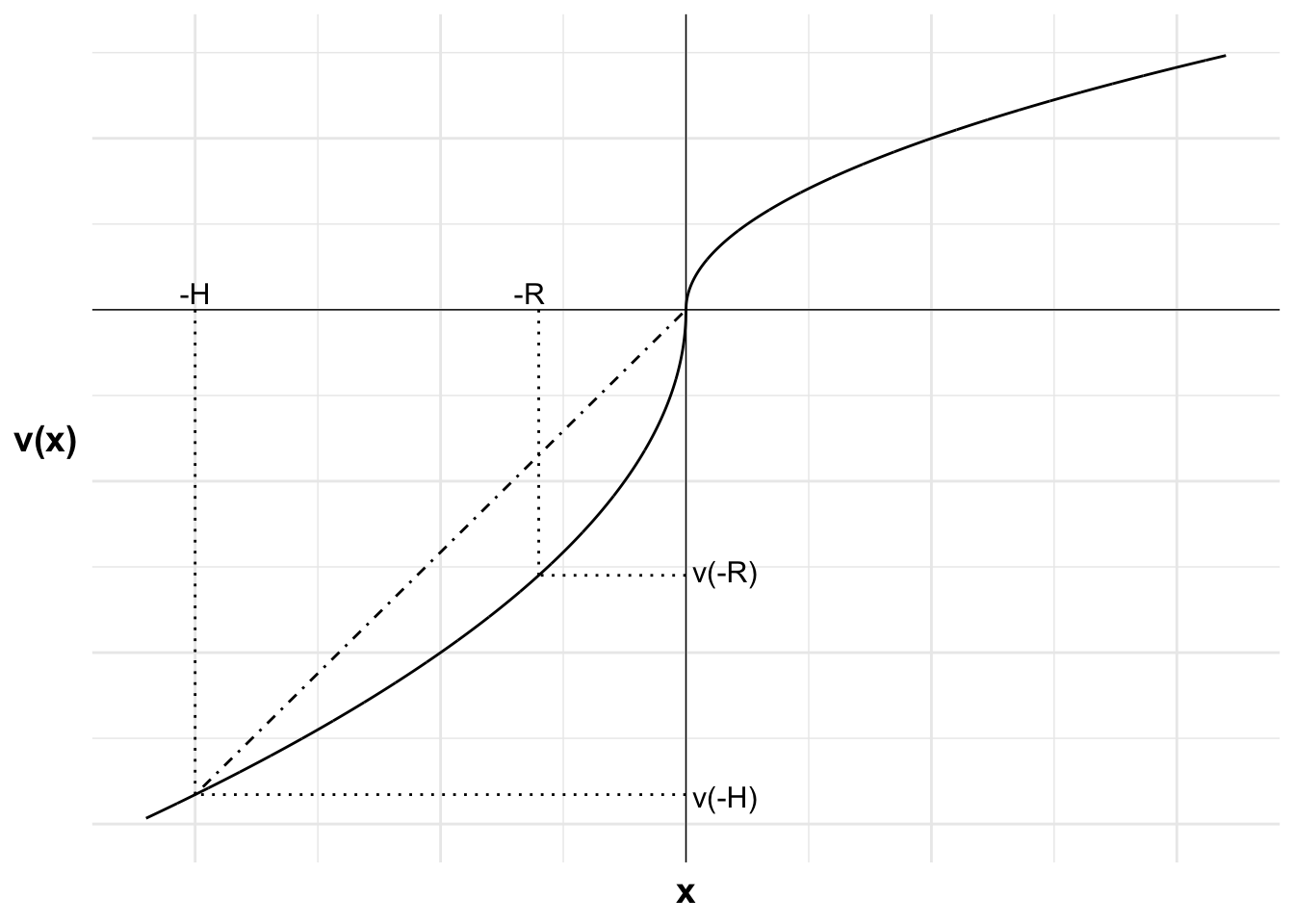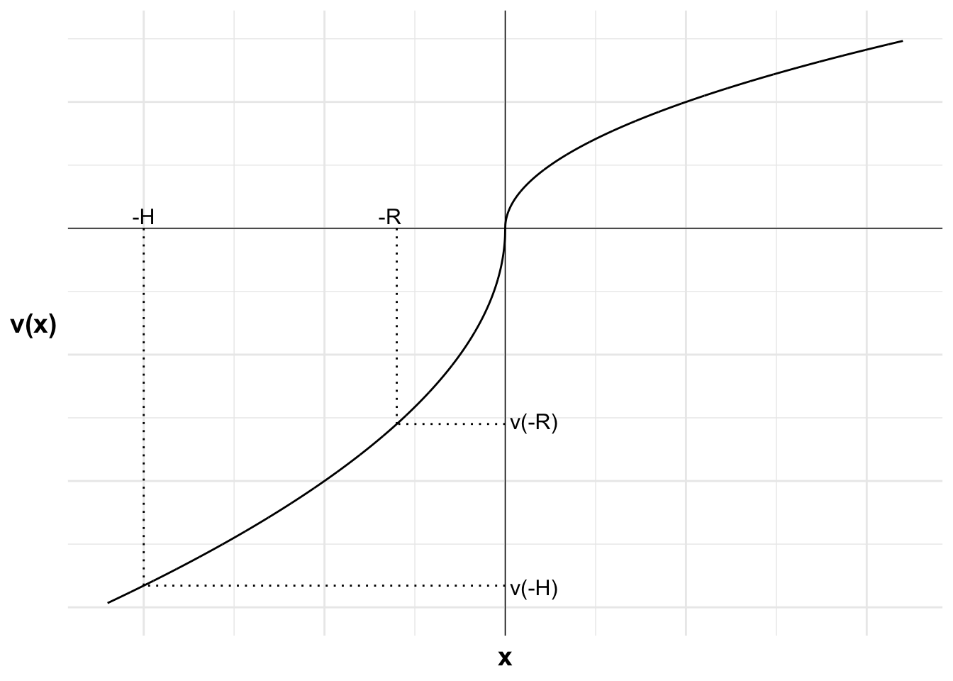 library(ggplot2)u <-function(x){ifelse (x >=0, x^0.5, -2*(-x)^0.5)}df <-data.frame(x =seq(-220, 220, 0.1),y =u(seq(-220, 220, 0.1)))#Variables for plot (may not match labels as not done to scale)#Payoffs from gamblex1<--200#lossx2<-0#winev<--30#expected value of gamblexc<--60#certain outcomepx2<-(ev-x1)/(x2-x1)ggplot(mapping =aes(x, y)) +#Plot the utility curvegeom_line(data = df) +geom_vline(xintercept =0, linewidth=0.25)+geom_hline(yintercept =0, linewidth=0.25)+labs(x ="x", y ="v(x)")+# Set the themetheme_minimal()+#remove numbers on each axistheme(axis.text.x =element_blank(),axis.text.y =element_blank(),axis.title=element_text(size=14,face="bold"),axis.title.y =element_text(angle=0, vjust=0.5))+#limit to y greater than zero and x greater than -8 (need -8 so space for y-axis labels)coord_cartesian(xlim =c(-220, 220), ylim =c(-30, 15))+#Add labels -H, v(L) and line to curve indicating eachannotate("text", x = x1, y =0, label ="-H", size =4, hjust =0.5, vjust =-0.3)+annotate("segment", x = x1, y =0, xend = x1, yend =u(x1), linewidth =0.5, colour ="black", linetype="dotted")+annotate("segment", x =0, y =u(x1), xend = x1, yend =u(x1), linewidth =0.5, colour ="black", linetype="dotted")+annotate("text", x =0, y =u(x1), label ="v(-H)", size =4, hjust =-0.1, vjust =0.6)+#Add labels -R, v(-R) and line to curve indicating eachannotate("text", x = xc, y =0, label ="-R", size =4, hjust =0.8, vjust =-0.3)+annotate("segment", x = xc, y =0, xend = xc, yend =u(xc), linewidth =0.5, colour ="black", linetype="dotted")+annotate("segment", x =0, y =u(xc), xend = xc, yend =u(xc), linewidth =0.5, colour ="black", linetype="dotted")+annotate("text", x =0, y =u(xc), label ="v(-R)", size =4, hjust =-0.1, vjust =0.3)