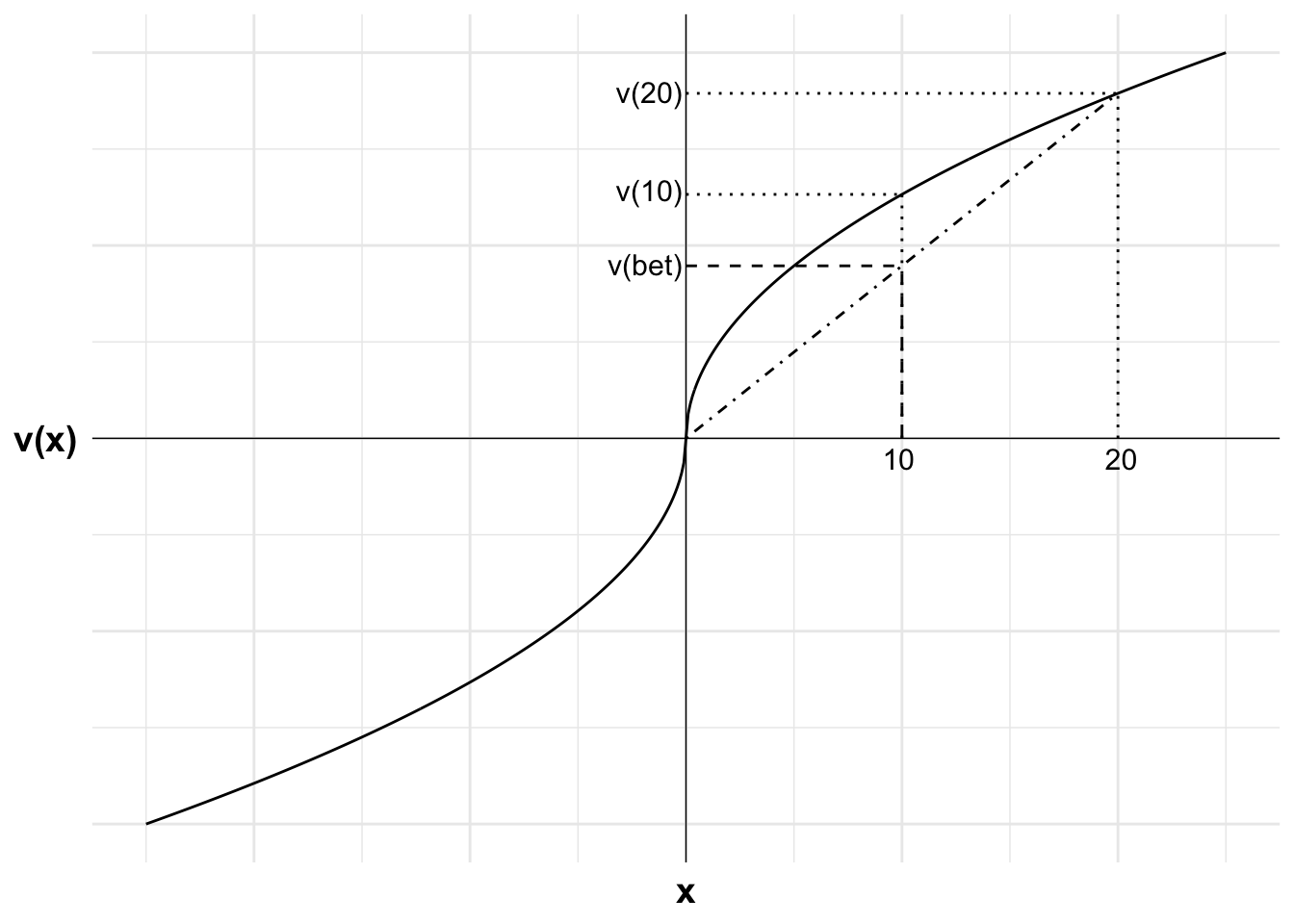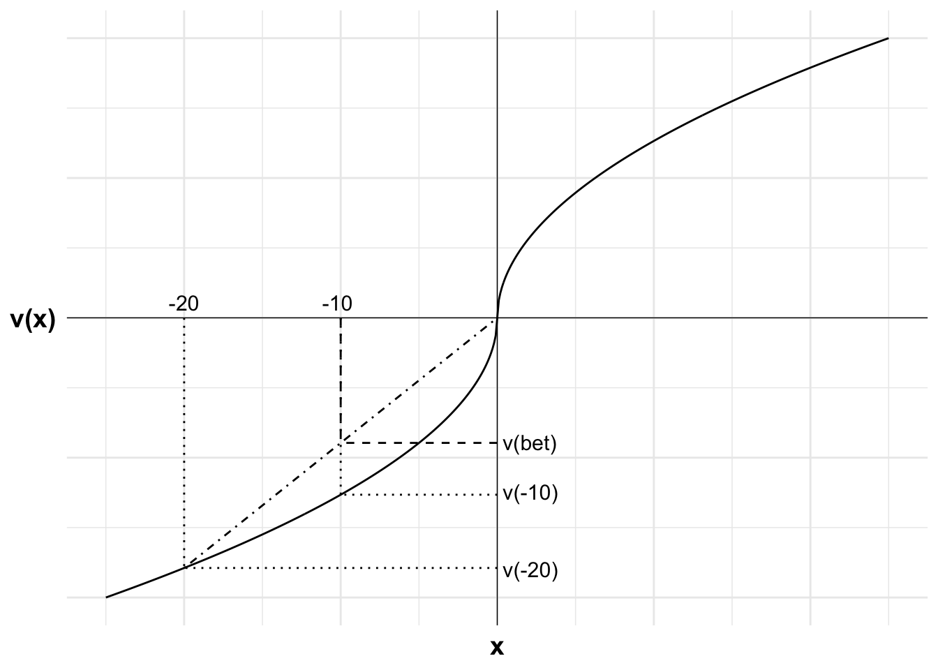 The following chart illustrates. Plotted are the value of the certain payment of -$10 and the outcome from losing the gamble, -$20. A win results in value of 0.
