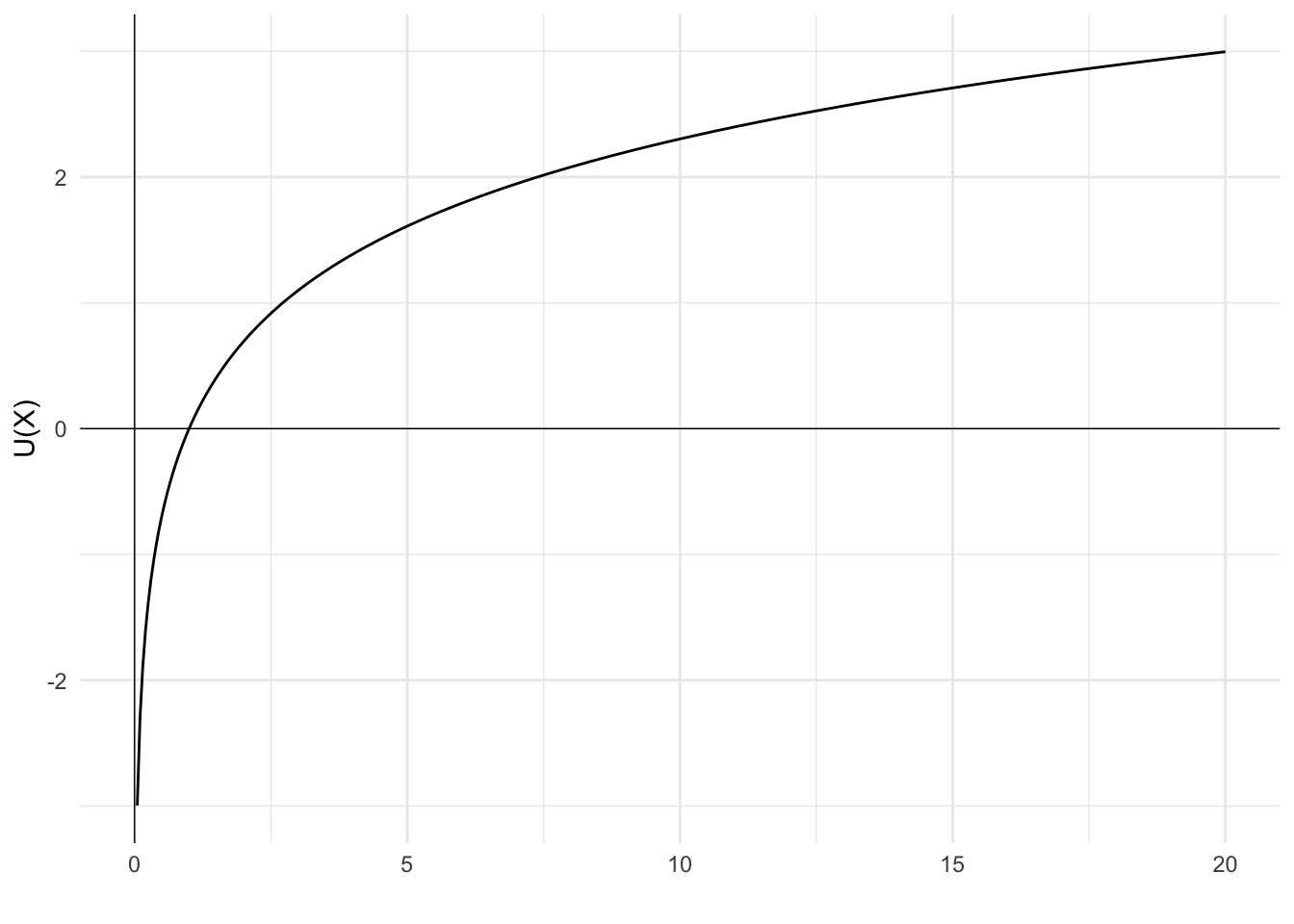 library(ggplot2)df <-data.frame(x =seq(0.05,20,0.05),y=NA)df$y <-log(df$x)ggplot(mapping =aes(x, y))+geom_line(data = df)+geom_vline(xintercept =0, linewidth=0.25)+geom_hline(yintercept =0, linewidth=0.25)+labs(x ="", y ="U(X)")+# Set the themetheme_minimal()