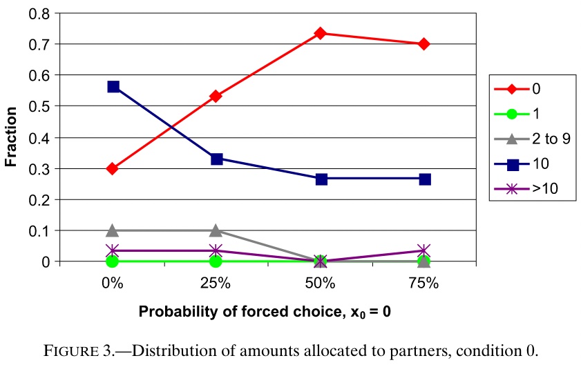 A computer then chose a distribution between the dictator and the receiver, selecting either ($0, $20) or ($20, $0) with equal probability. The dictator observes the computer’s allocation, but the receiver does not.