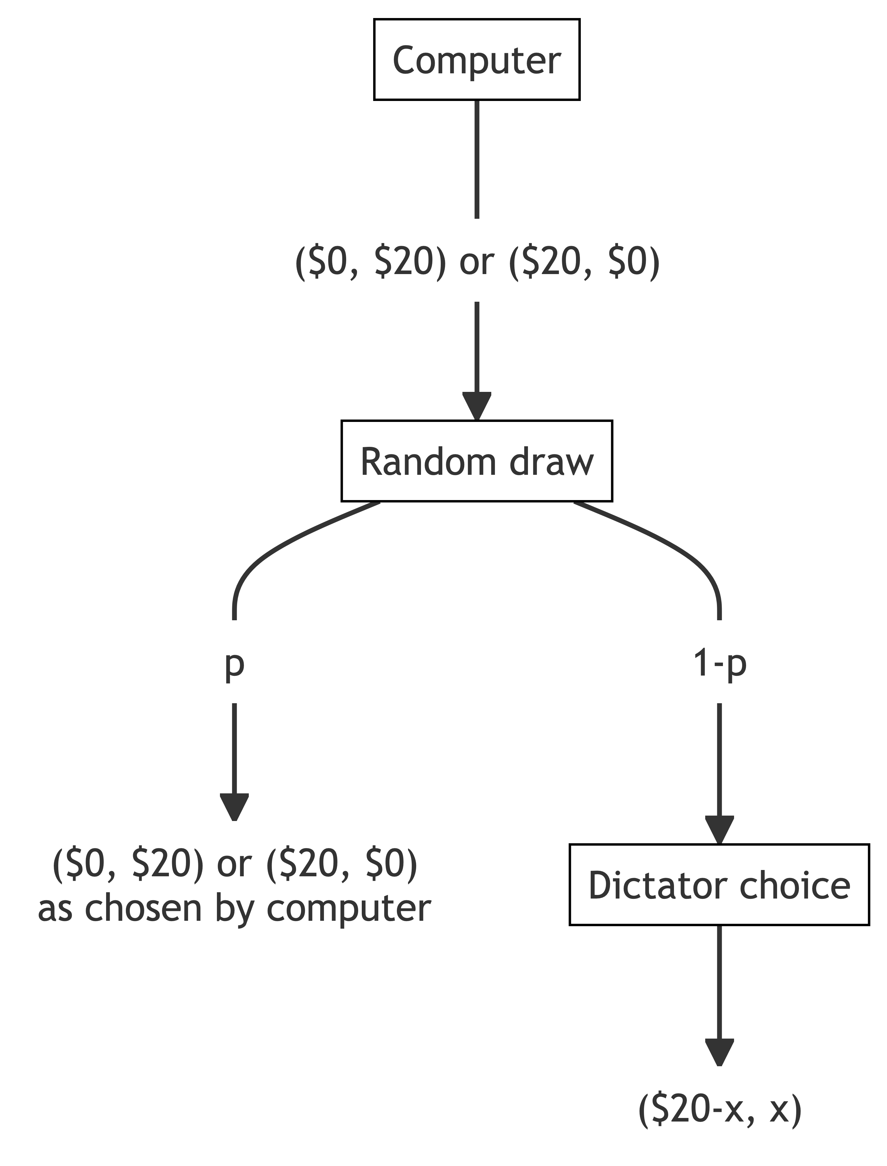 If the dictator’s choice is to be implemented, the dictator makes a split of the $20, offering x to the receiver. The receiver learns only the allocation. They do not learn the dictator’s choice.