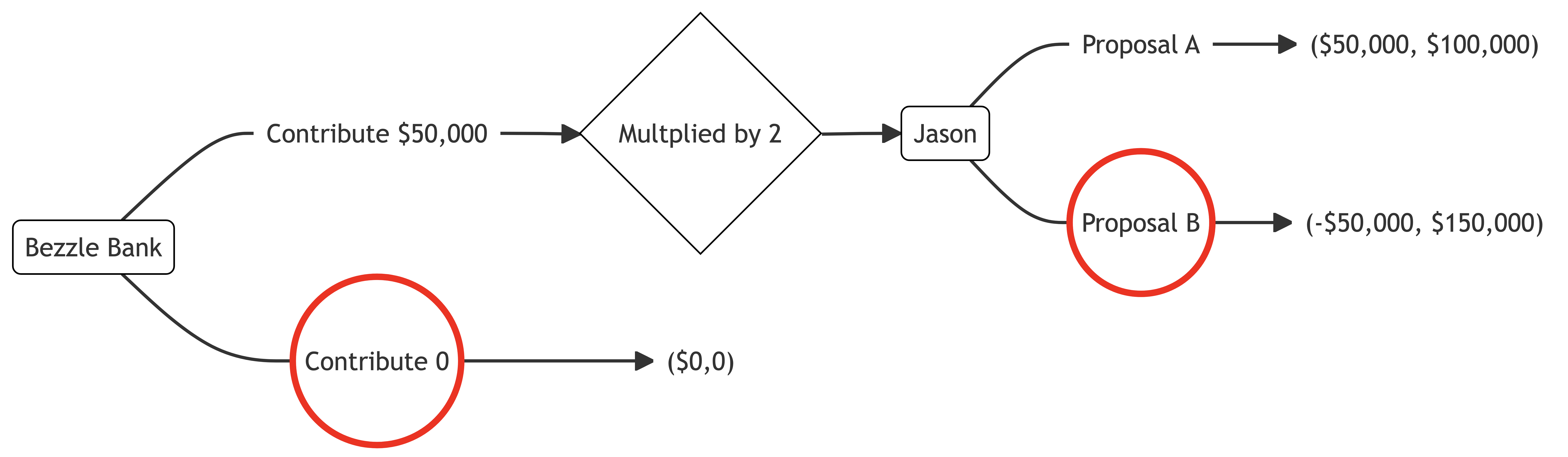 I have represented this problem in the following extensive form game. The possible payoffs for Bezzel Bank are $50,000 for proposal A ($100,000 minus it’s $50,000 contribution) and -$50,000 for proposal B (loss of its contribution). If Bezzle Bank does not contribute, both Jason and the Bank have a payoff of zero.